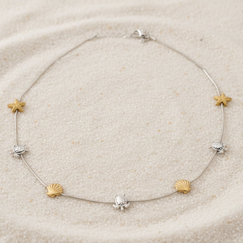 Silver rope chain necklace with gold sea shells, gold sea stars, and silver turtles charms.