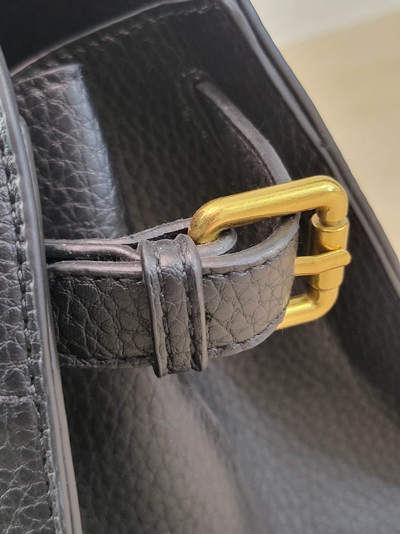Smooth faux leather textured handle satchel bag with adjustable side gold buckle detail, and an inner clasp closure.