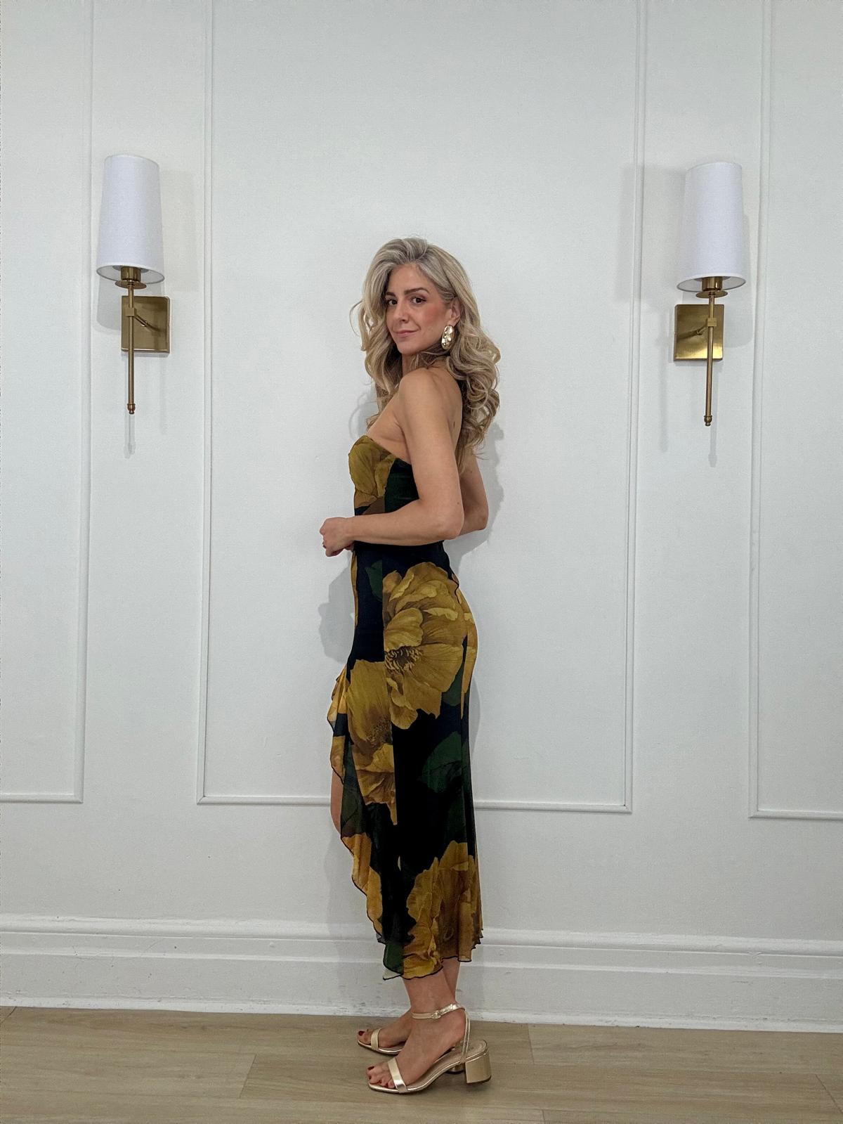 Mesh floral print strapless midi dress with keyhole cutout and center waist cutout with hardware detail. Invisible bra cups, and a side slit with a ruffle hem.