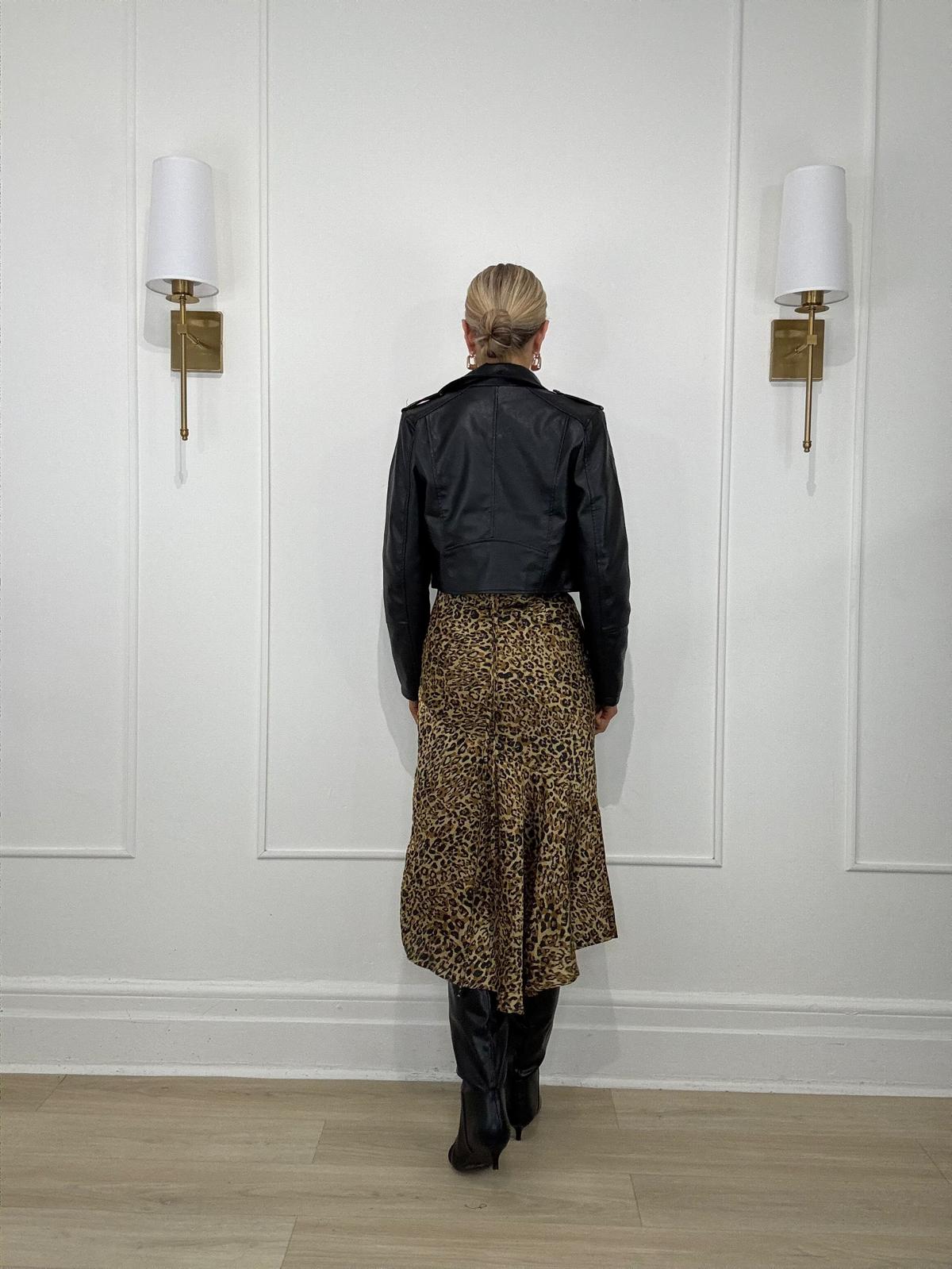 Leopard print midi dress with tie back detail, lace trim on both the v-neckline and side slit.