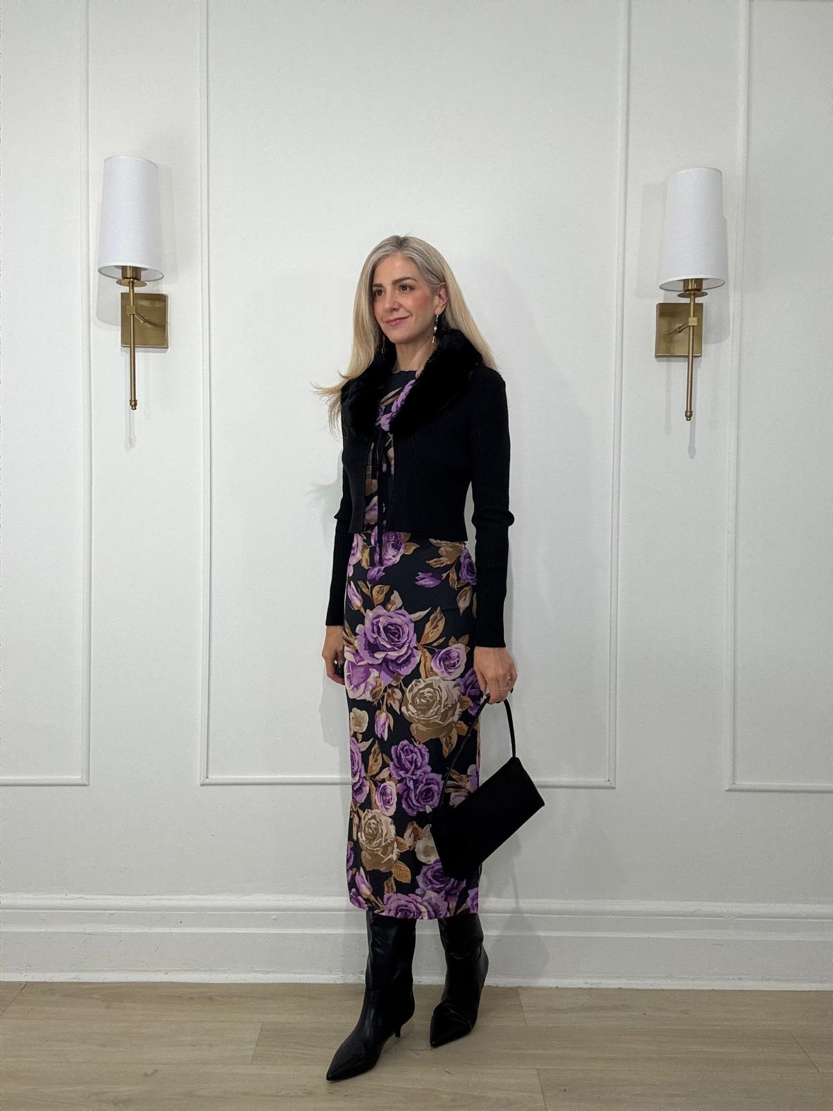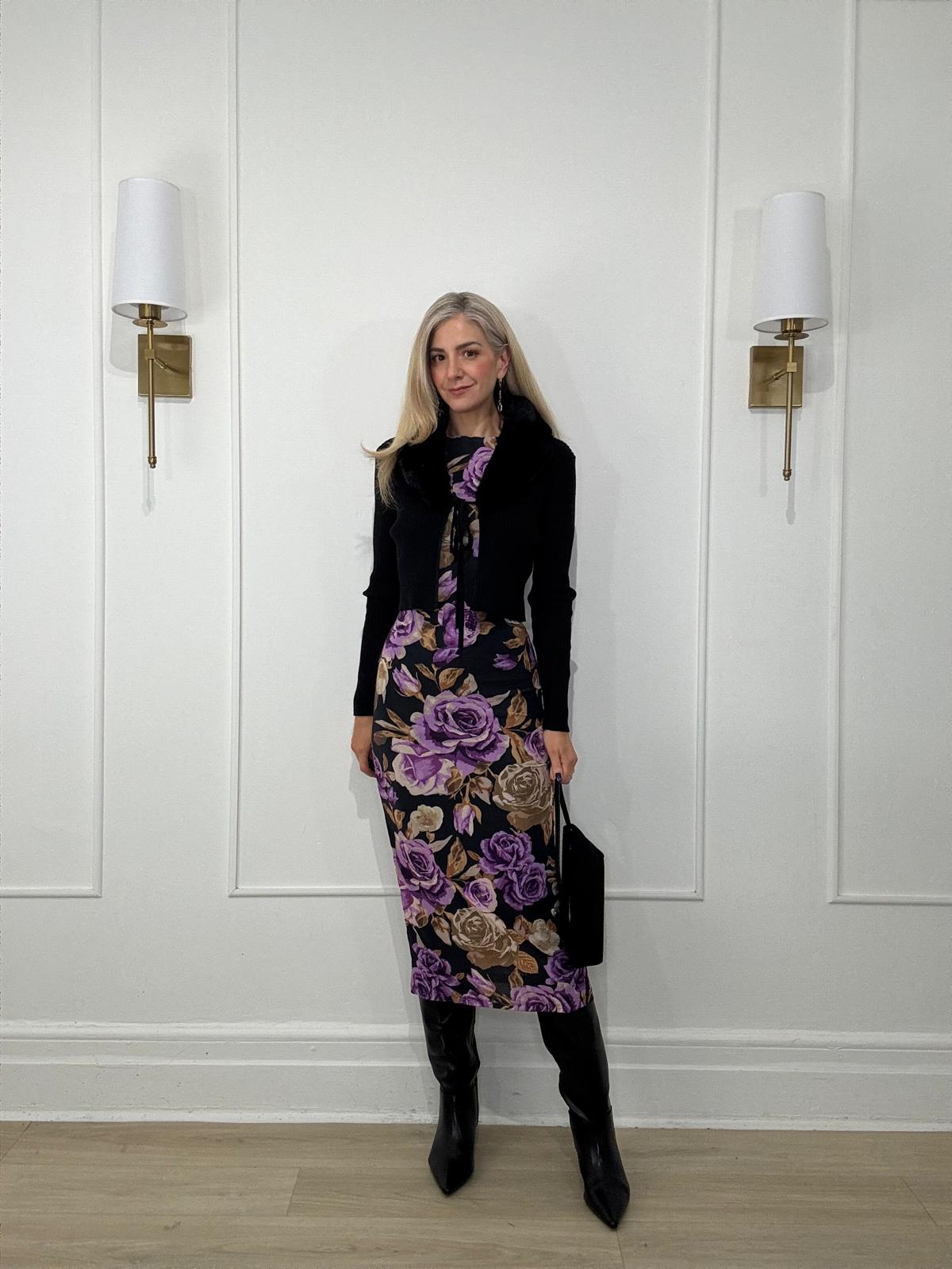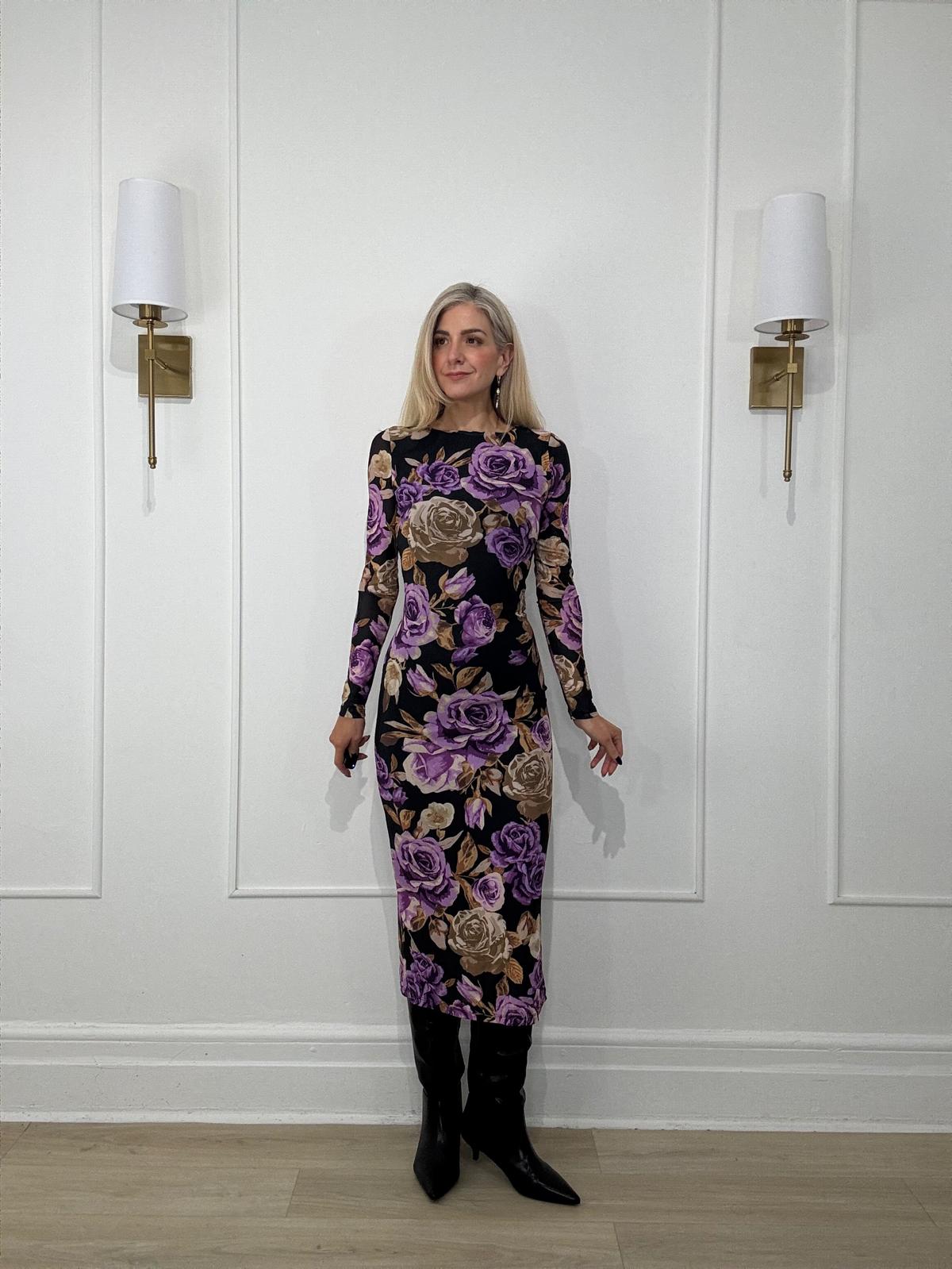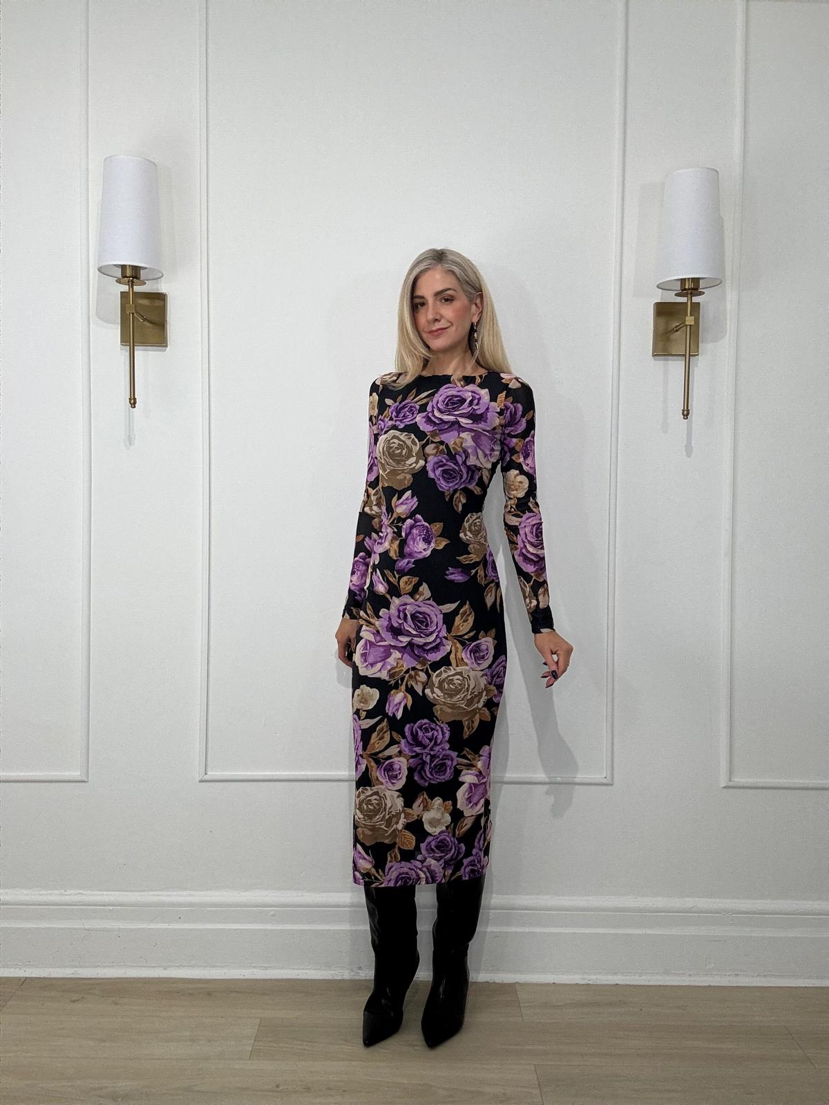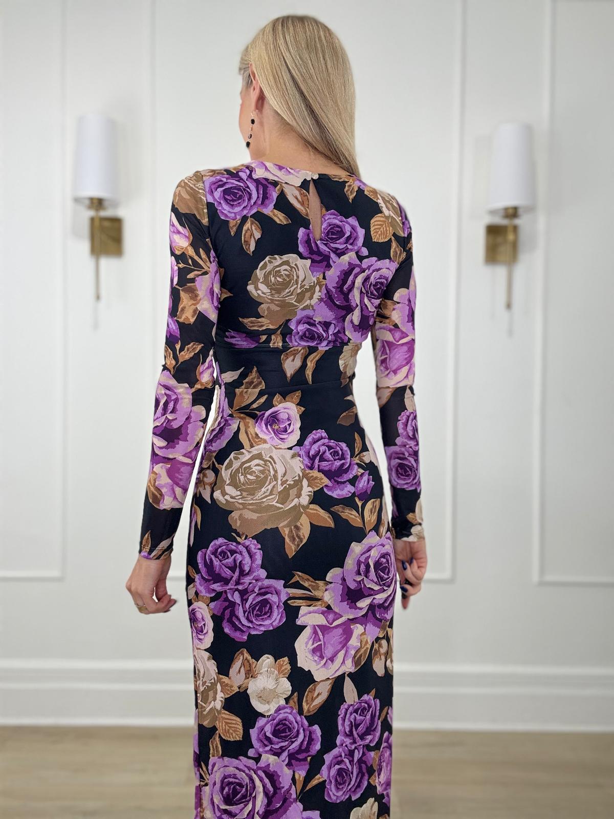 A printed power mesh midi dress featuring body contouring, round neckline, long sleeve and back neck button closure.