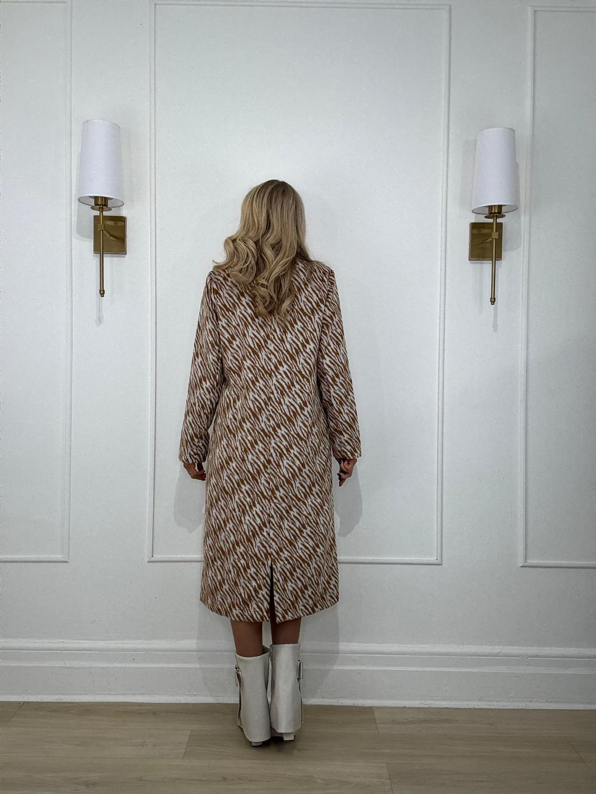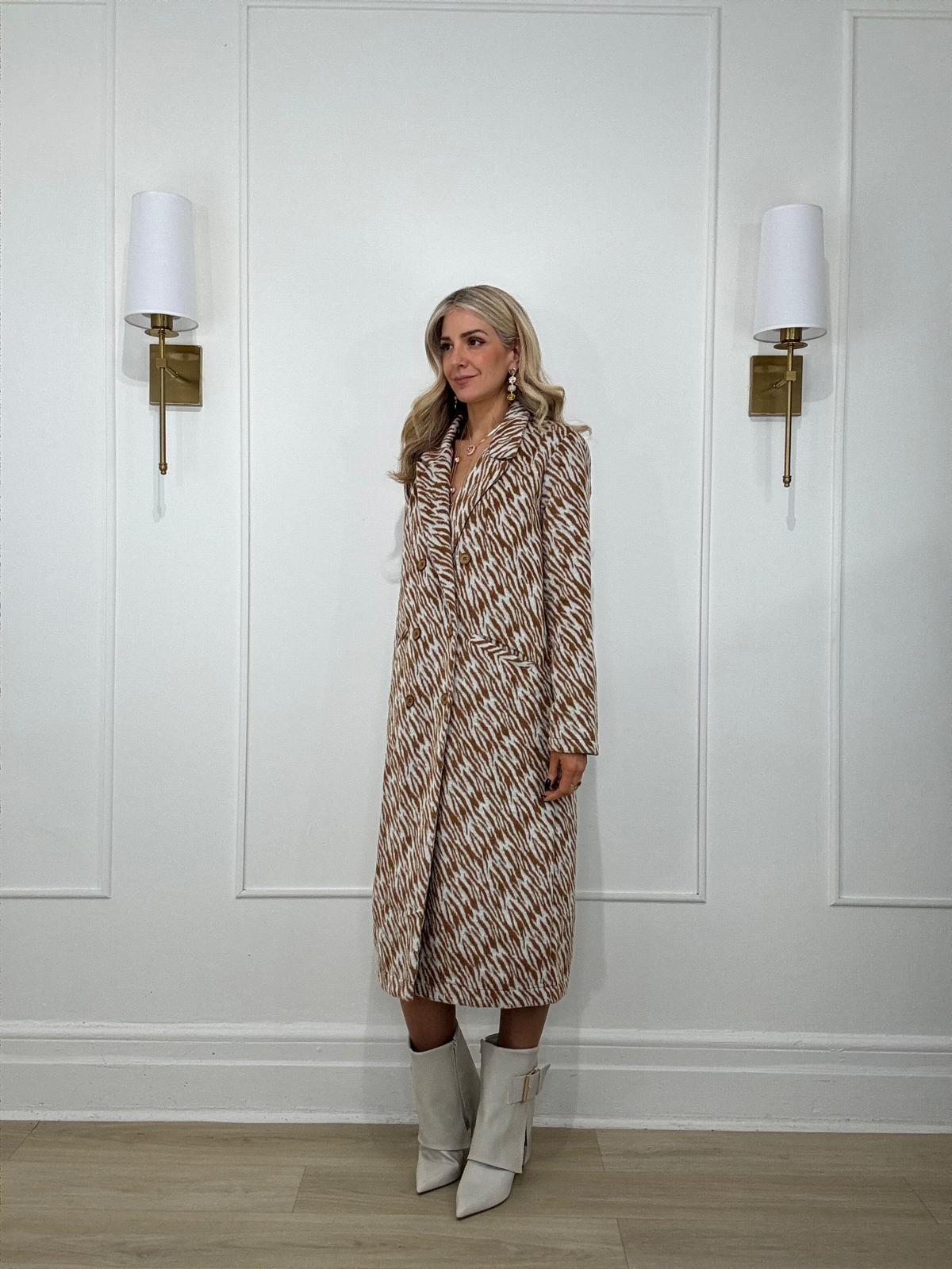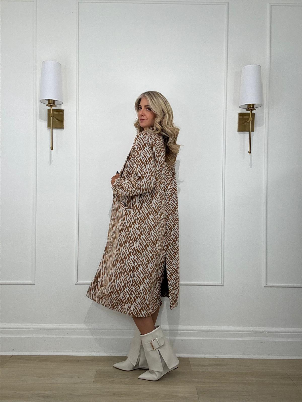 Zebra pattern brushed long coat tailored with notched lapels, slit side pockets and long sleeves.