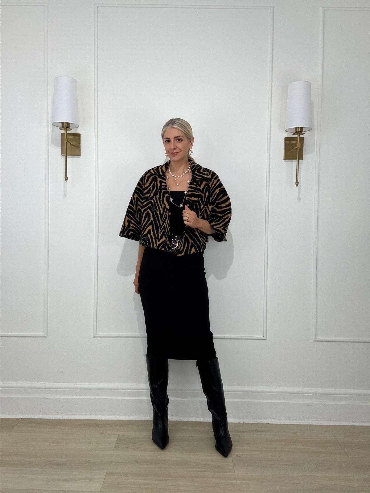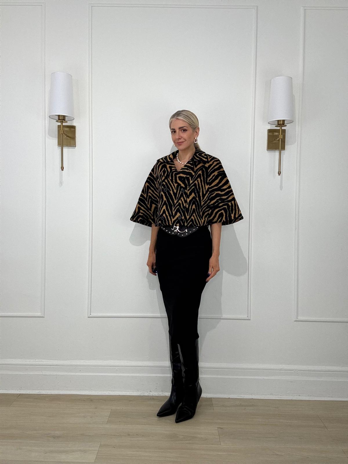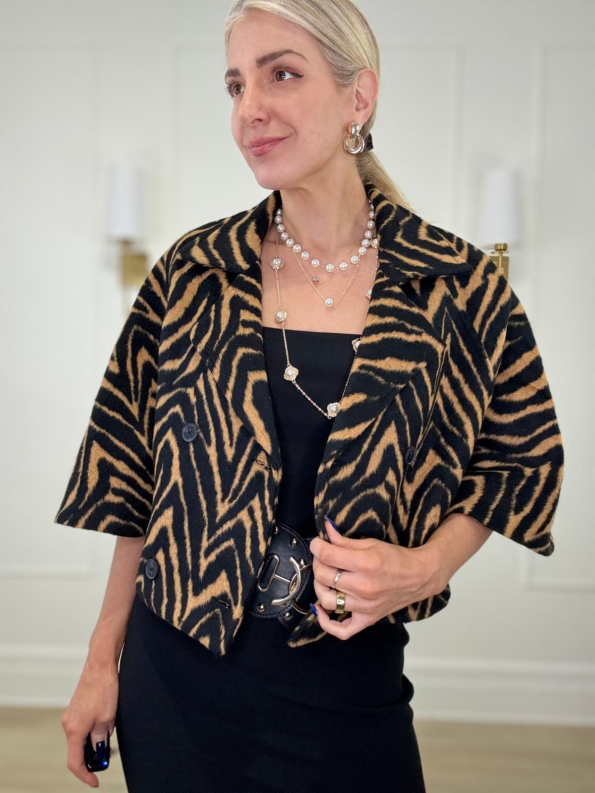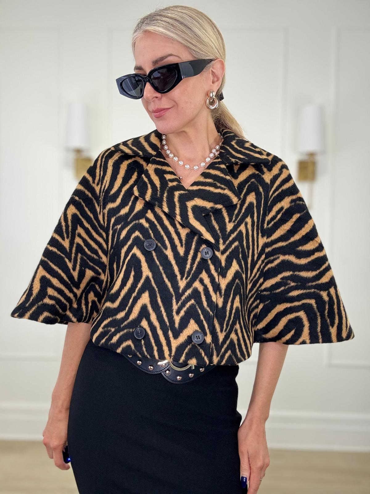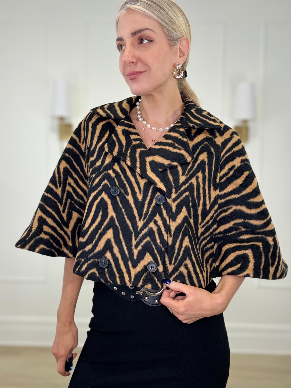 Stripe tiger print crop cape poncho blazer with lapel collar and two front button closure.