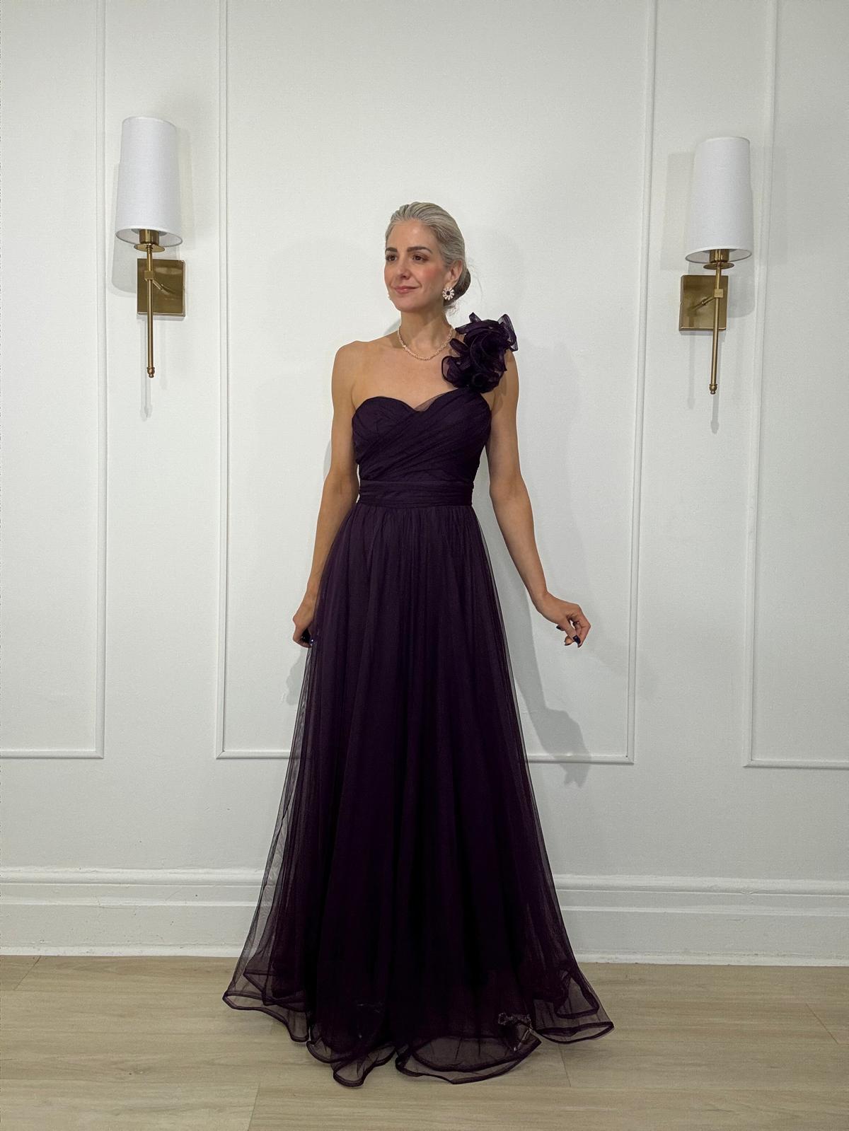 One shoulder mesh maxi dress with sweetheart neckline and a back lace up detail.