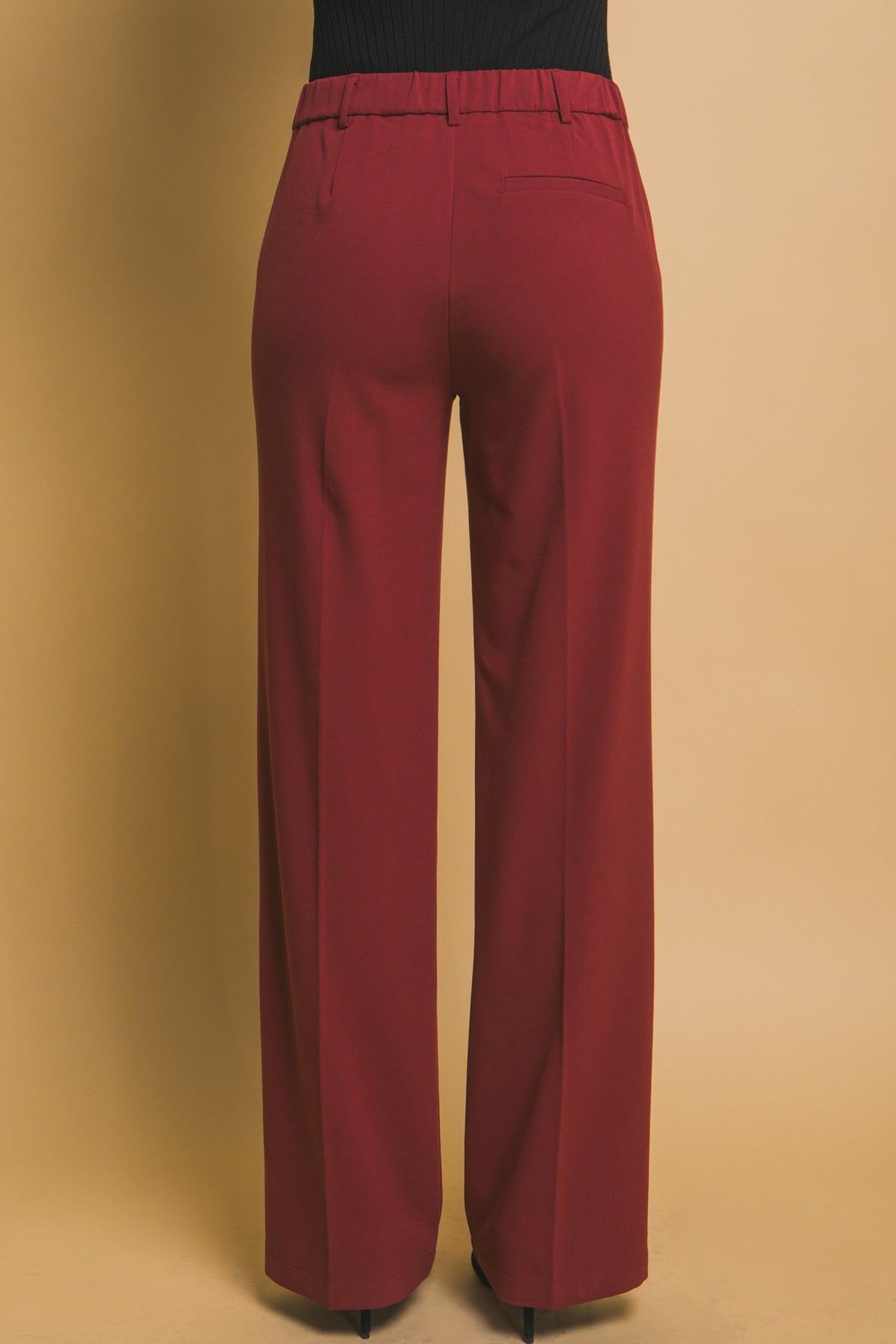 Solid formal straight cut pants with pockets, belt loops, and an elastisized waistband at back.