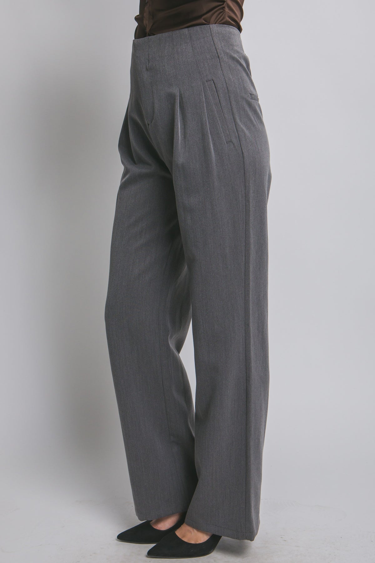 High waist straight leg pants with welt pockets & elastic back waist.
