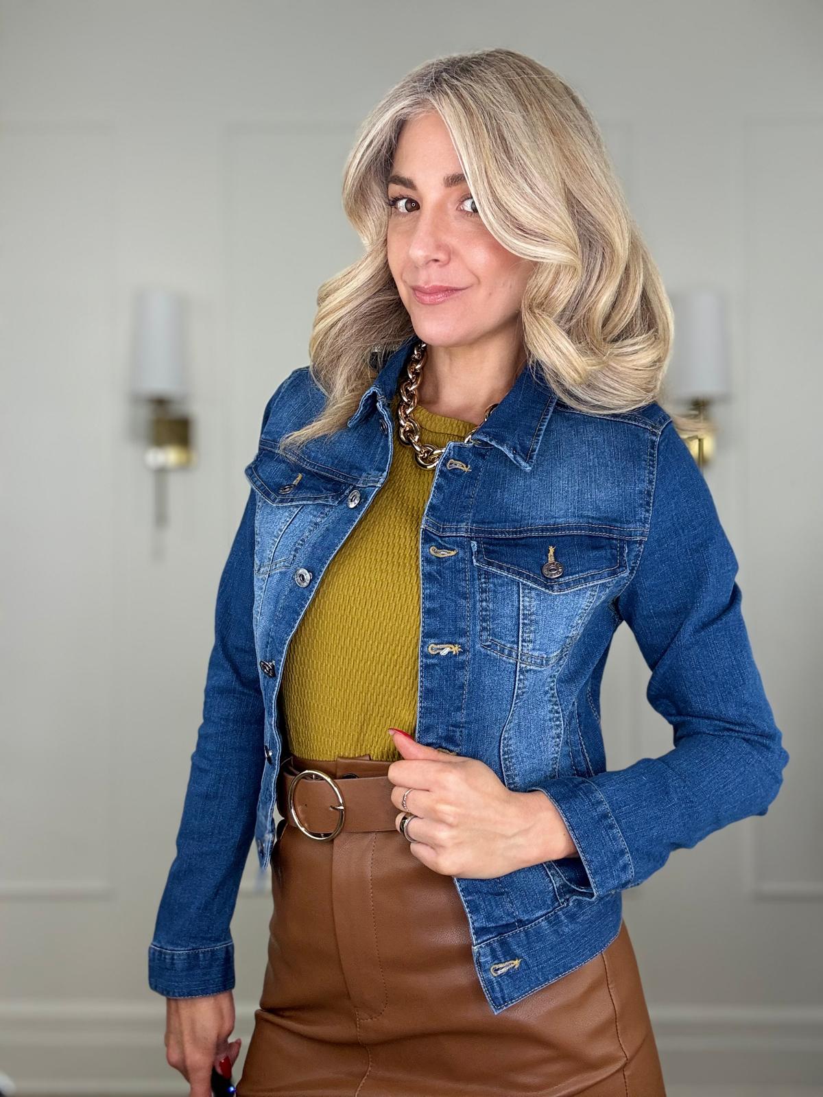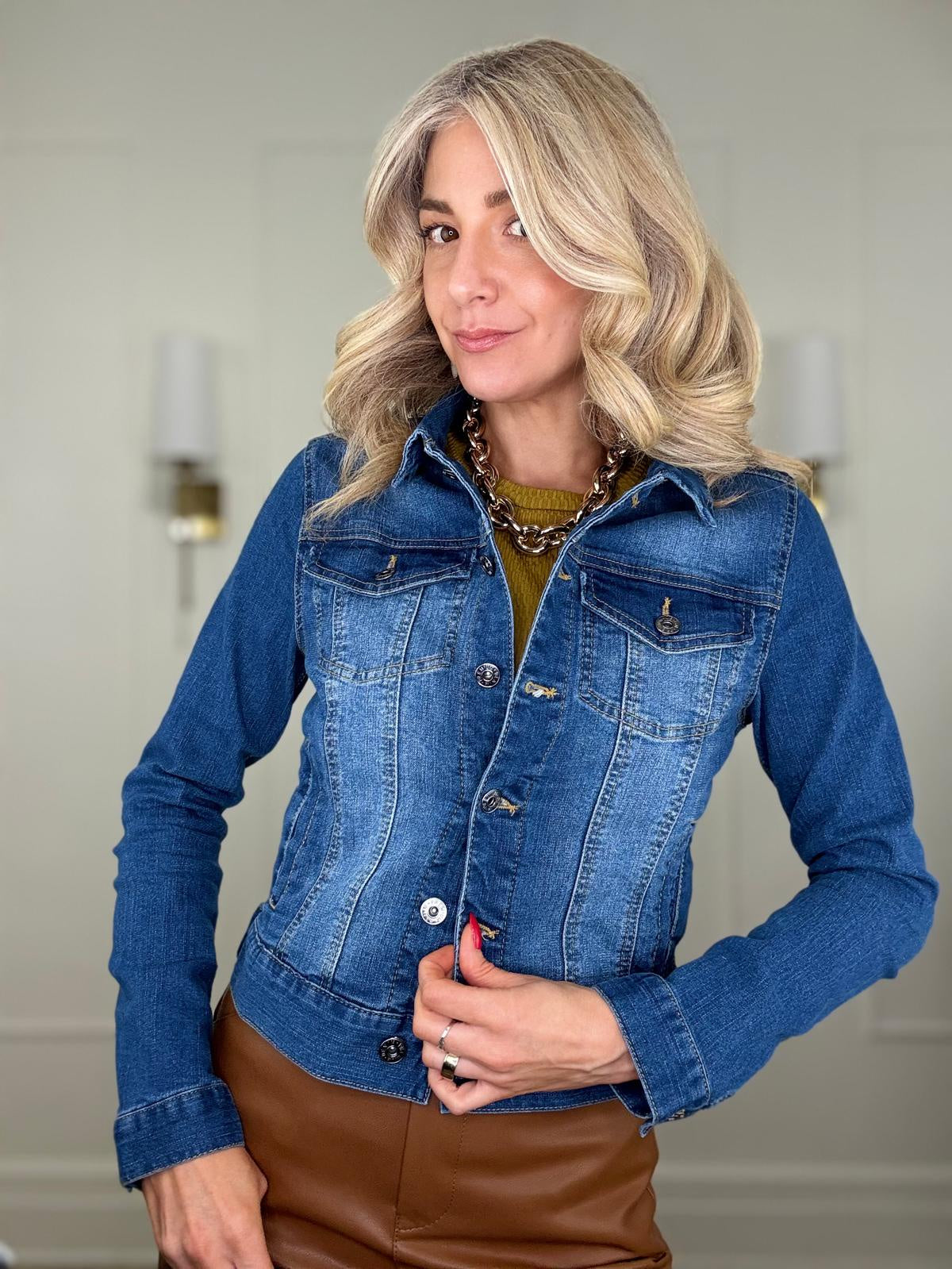 Distressed button up stretchy cotton denim jacket.