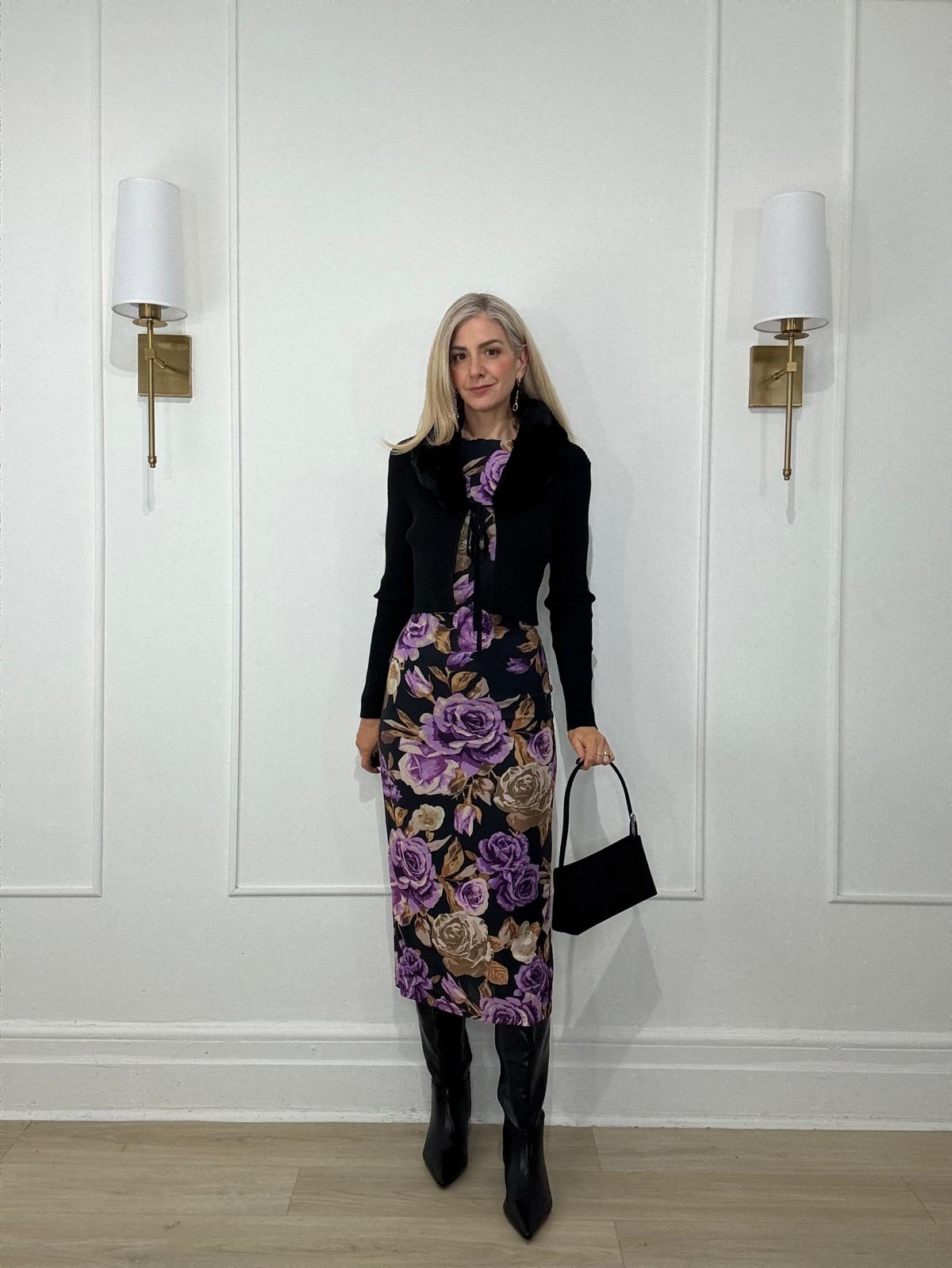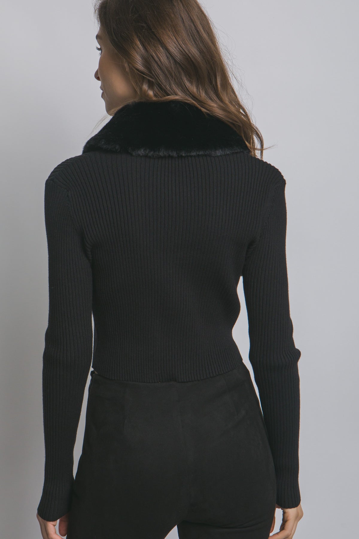Faux fur collar knit sweater cardigan with front tie closure and crop length.
