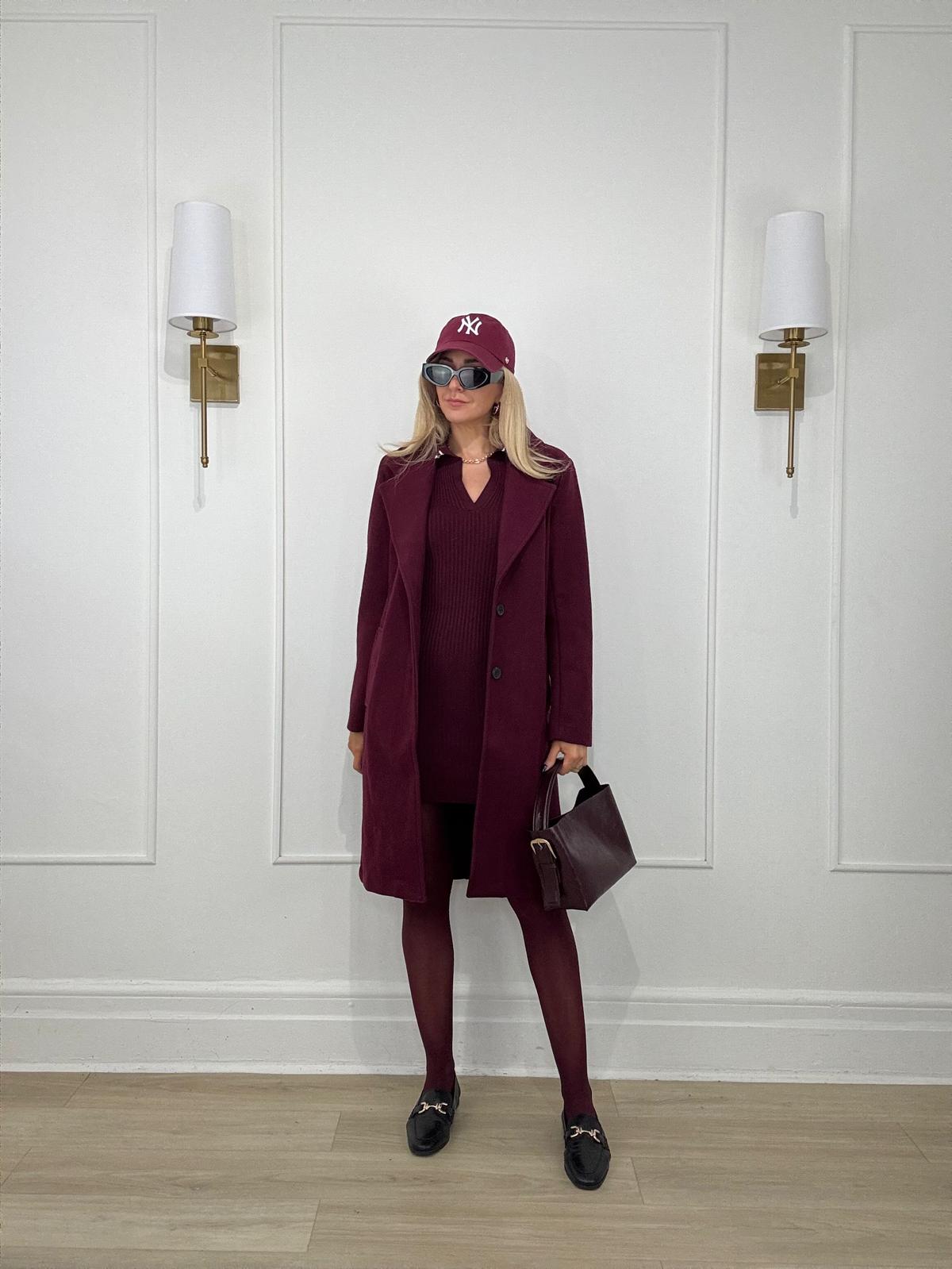 Ribbed knit collar v-neck long sleeve bodycon midi dress.