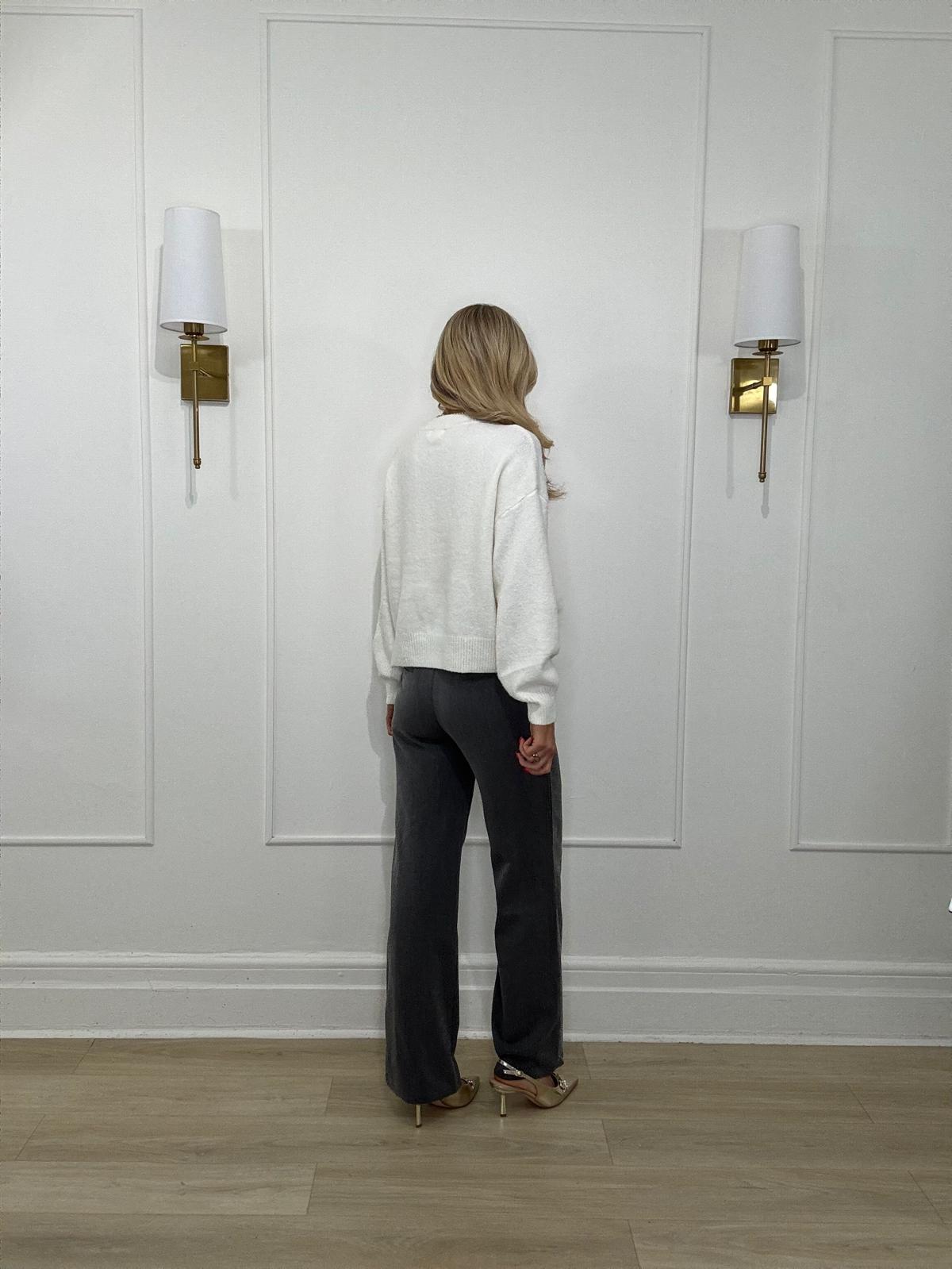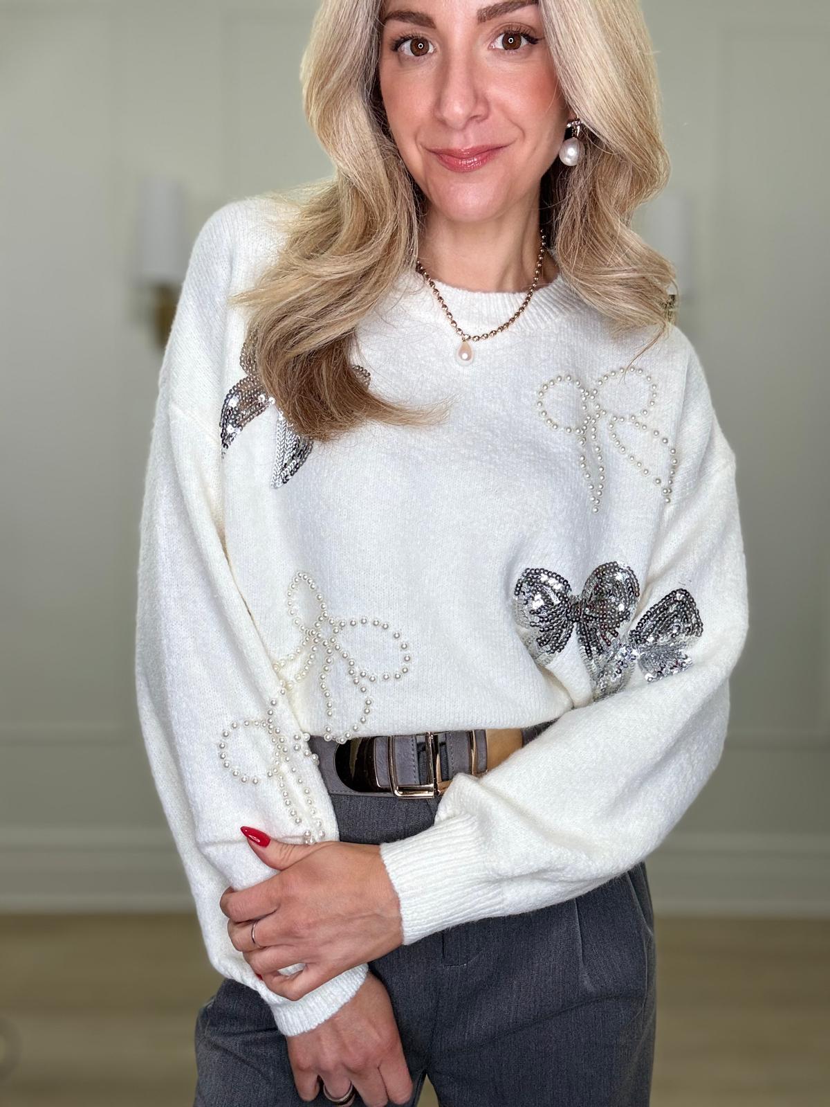 Round neck loose sweater with beautiful sequin and pearl bow design.