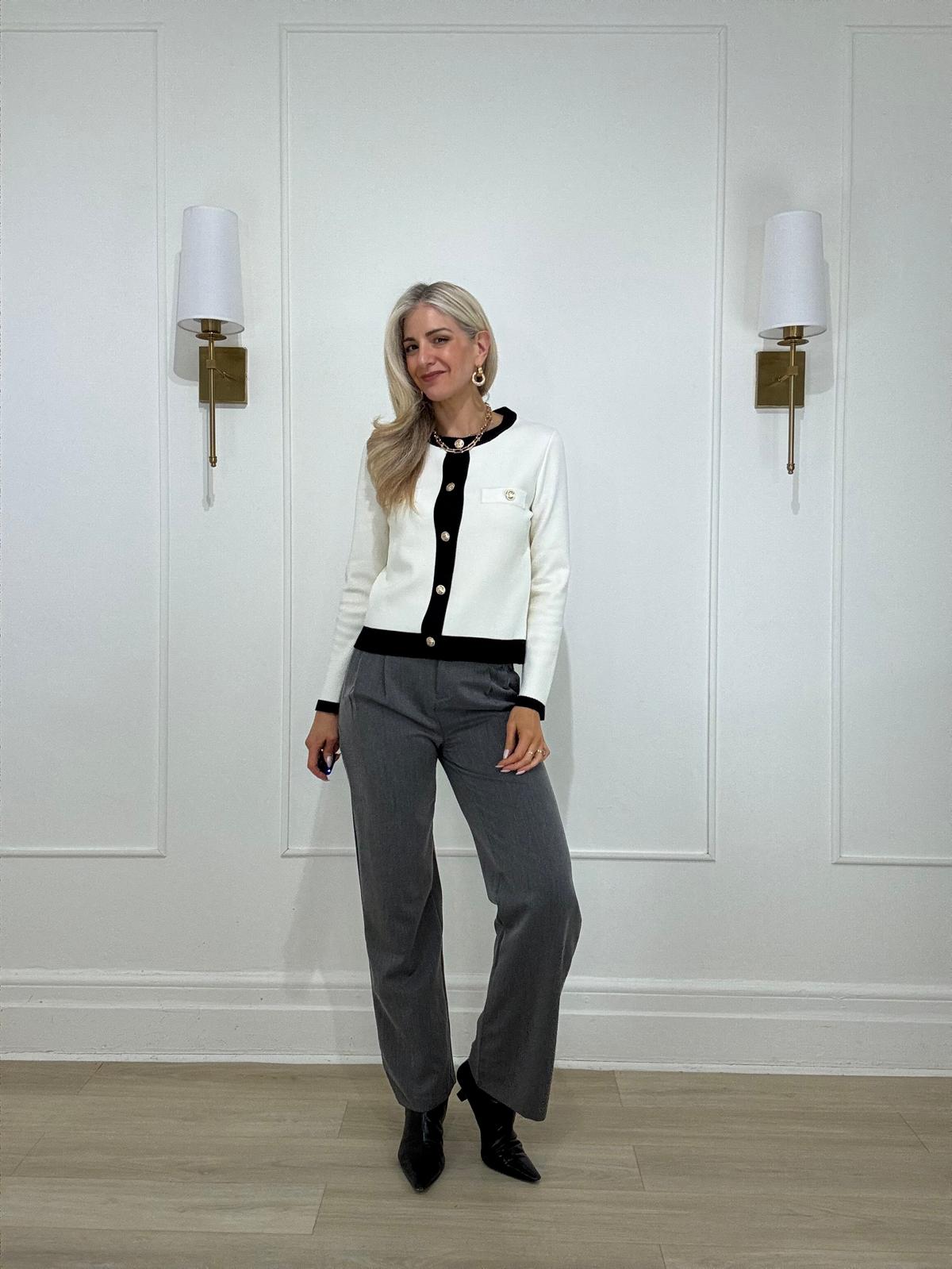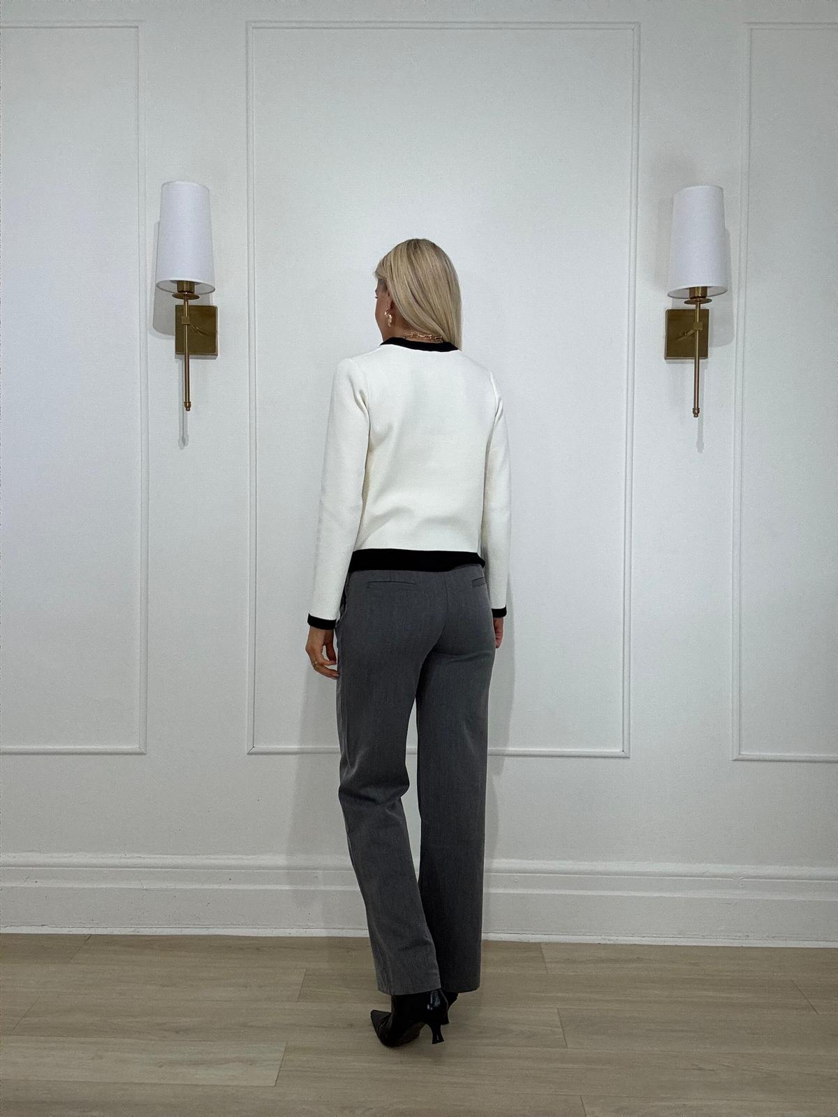 Round neck cardigan with contrast black piping hem, featuring gold button down closure and faux pocket squares.