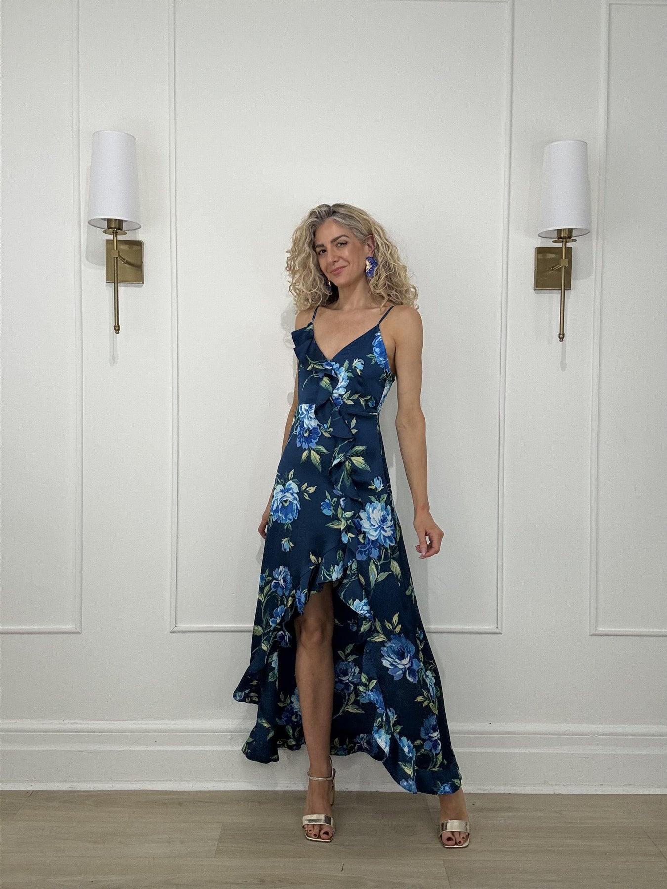 Floral and ruffle high low dress. Side zipper. Tie at back and adjustable straps. Shell and Lining: 100% Polyester