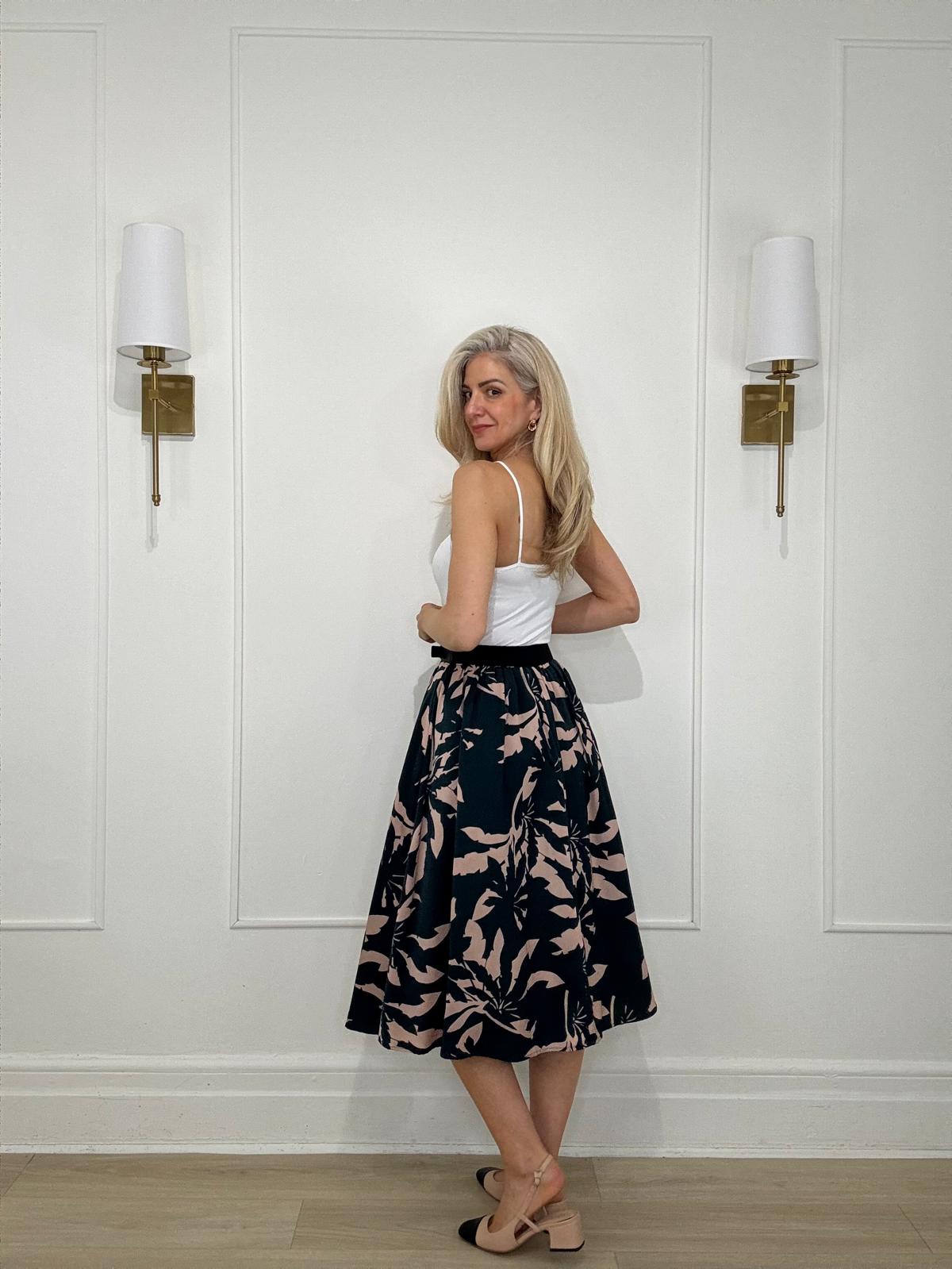 Leafy printed full midi skirt. A tulle layer and lining gives the skirt some structure and volume. Stretch at back of waist. Pockets.