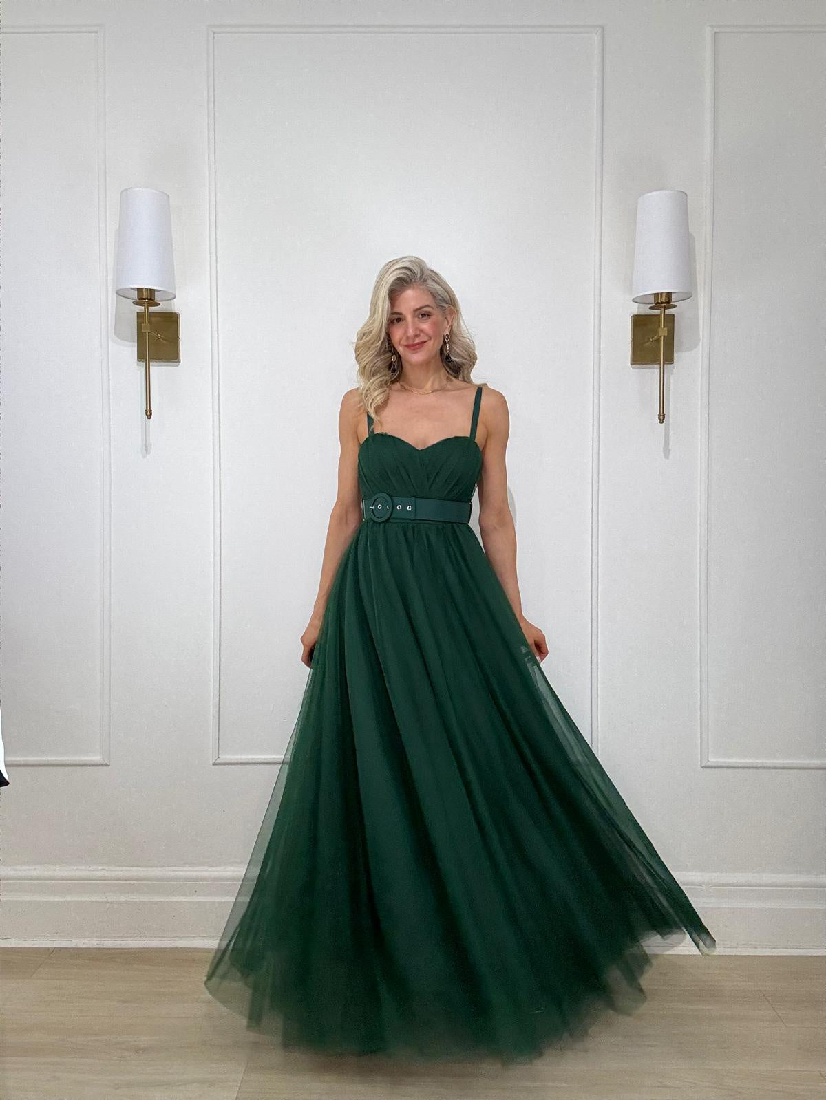 Mesh fit & flare maxi dress with removable matching belt, adjustable shoulder straps, and back zipper closure.