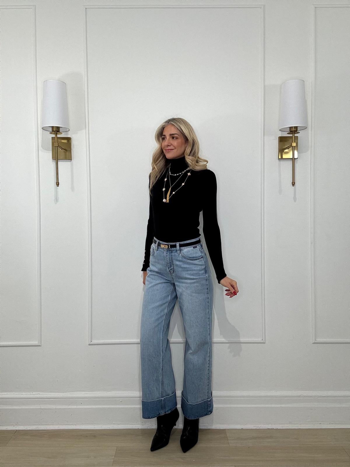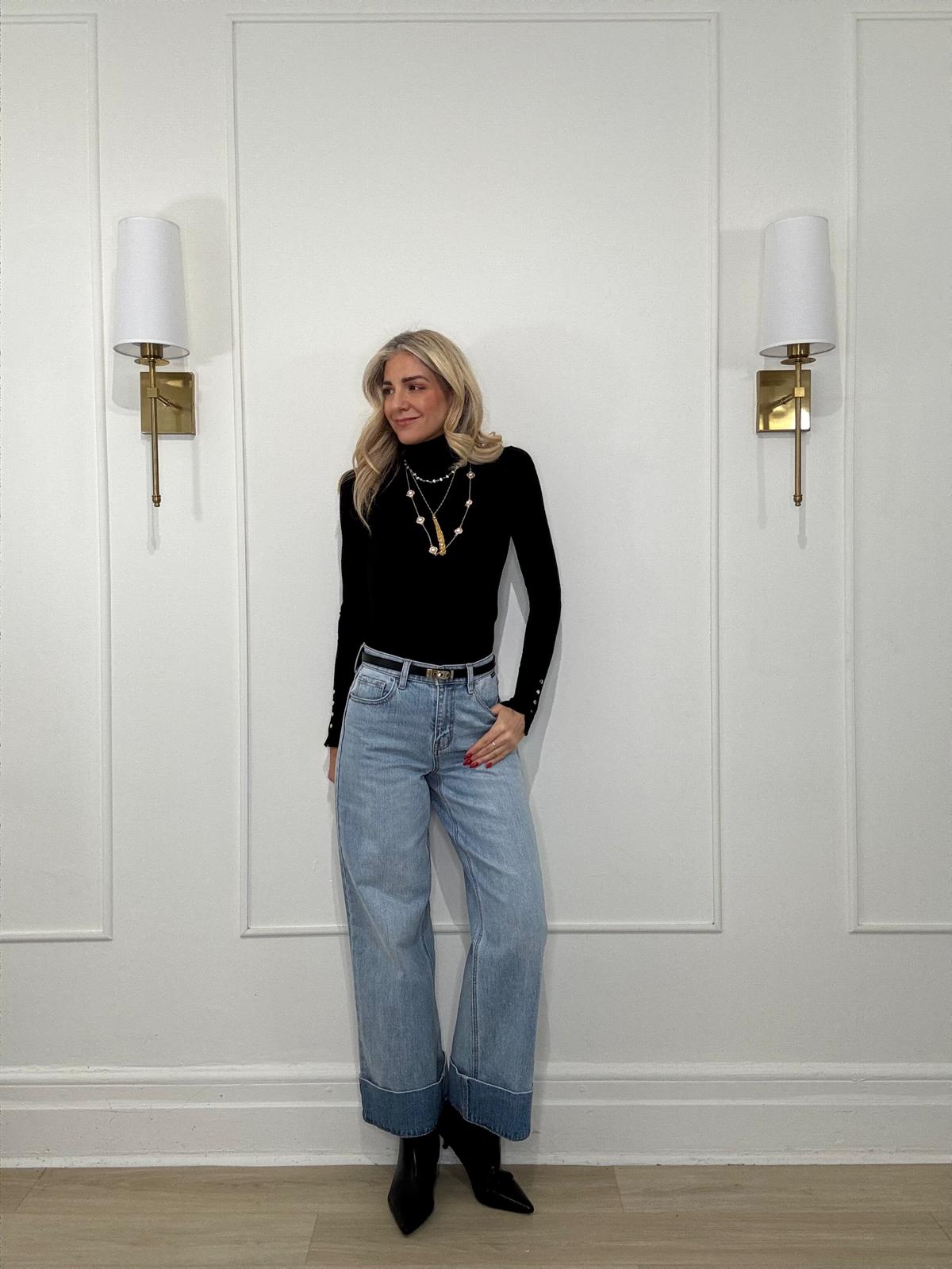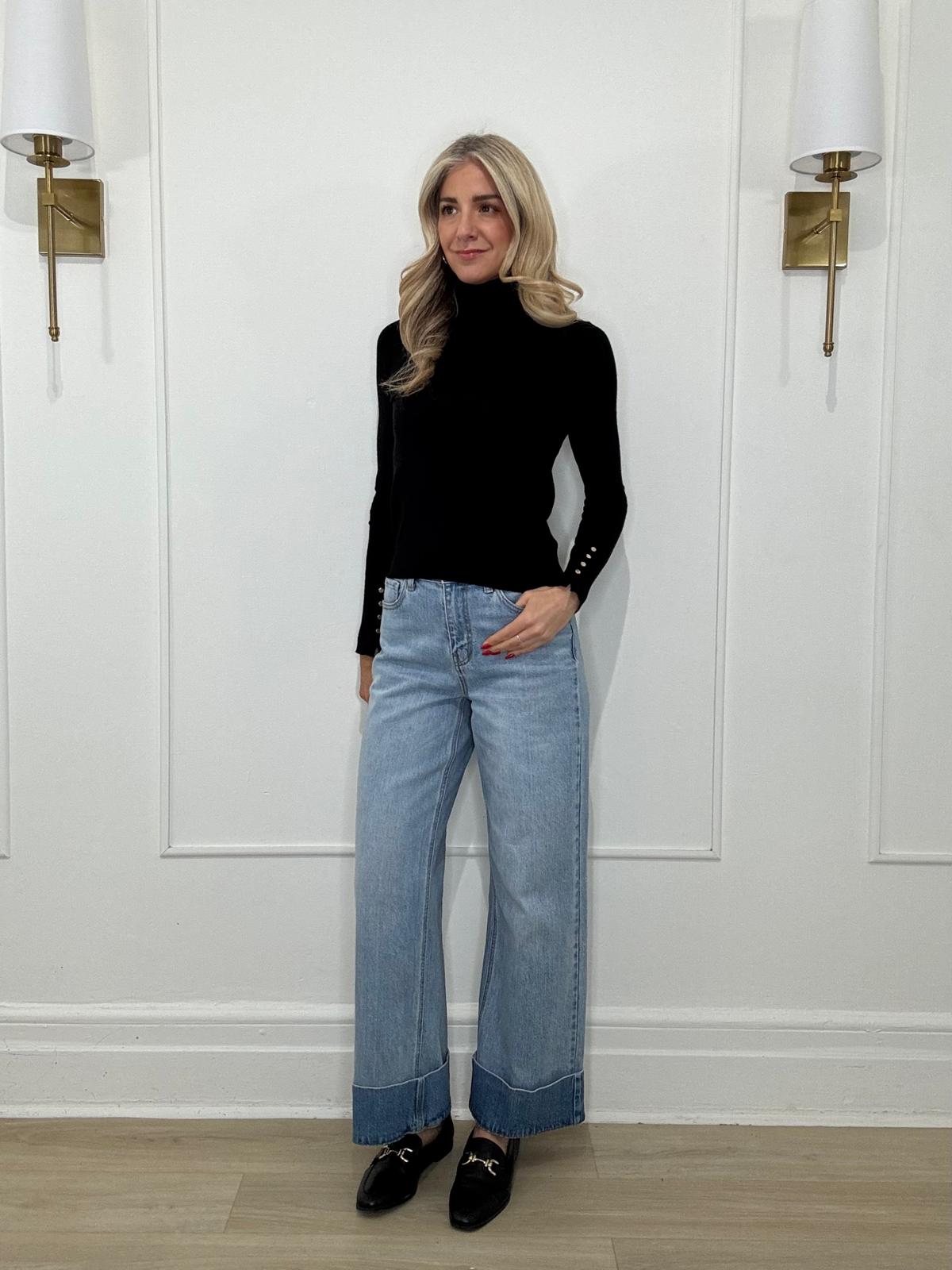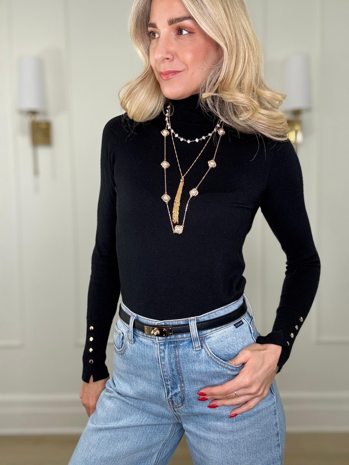 Turtle neck ribbed knit top featuring long sleeves with button detailing at cuffs.