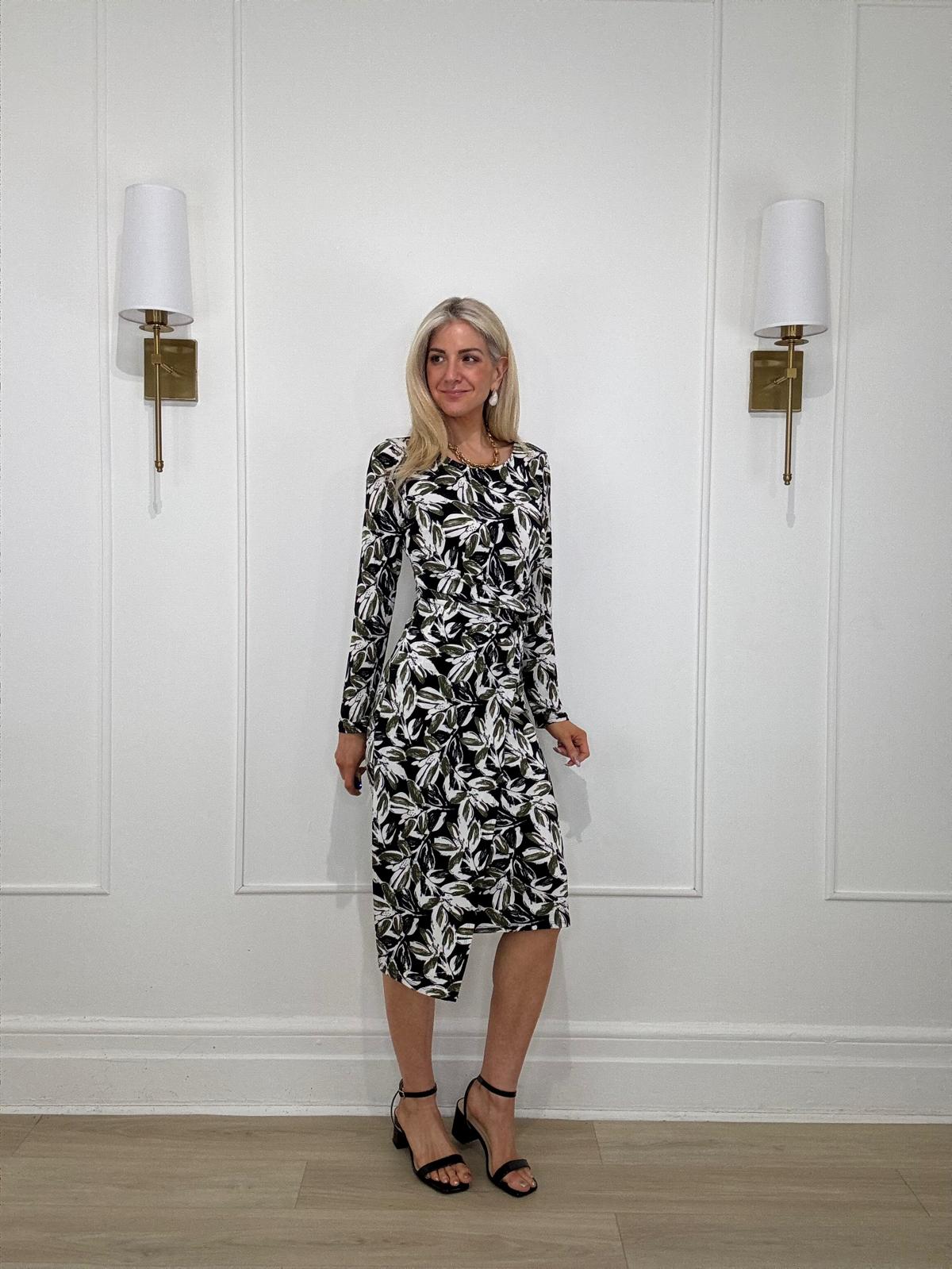 Leaf print round neck long sleever midi dress with side knot faux wrap detail.