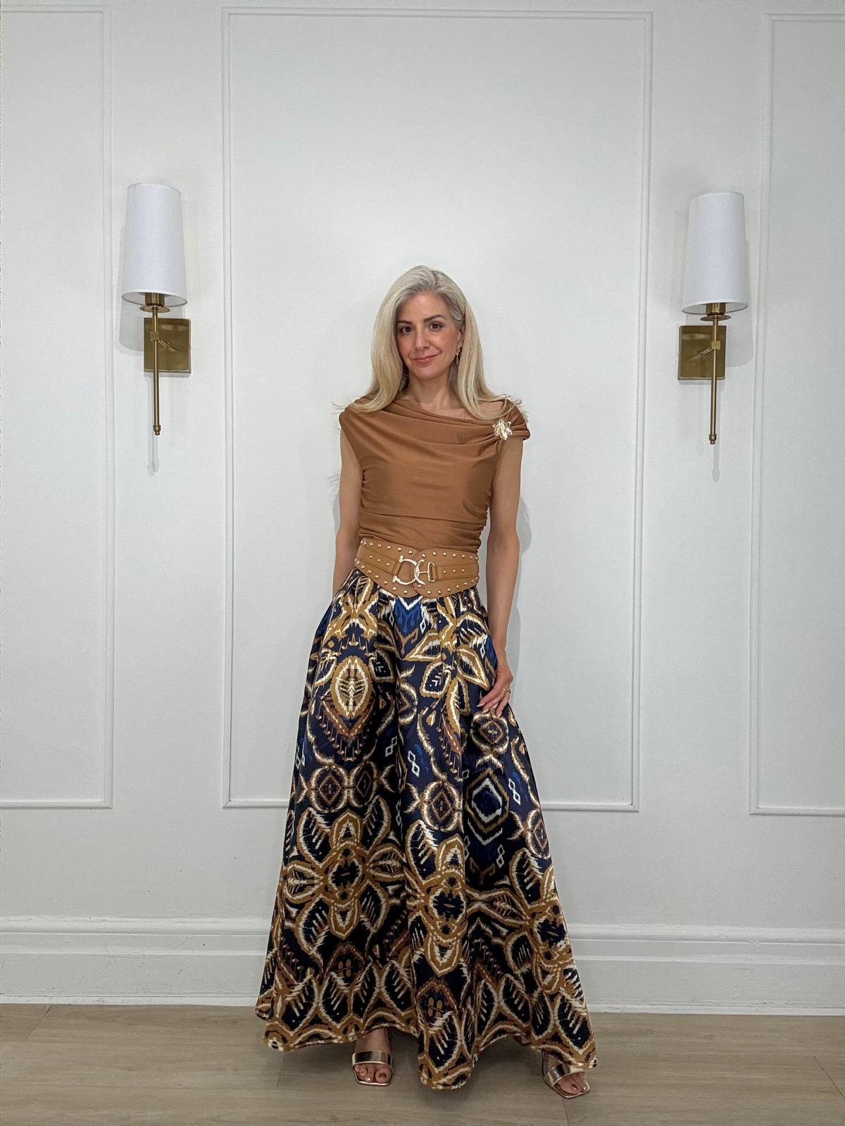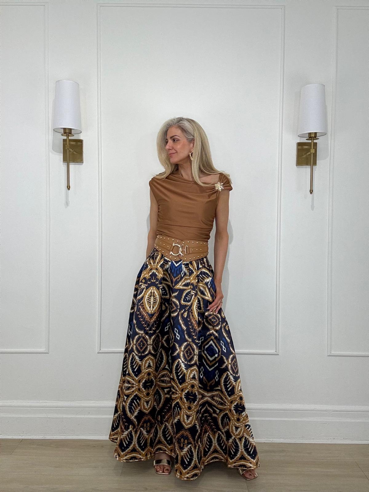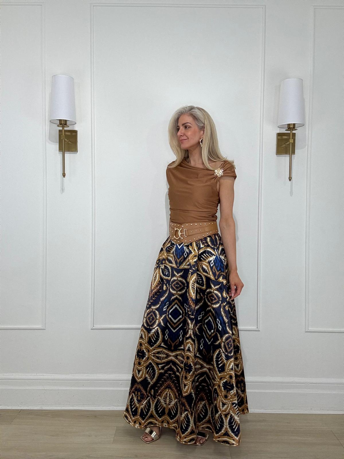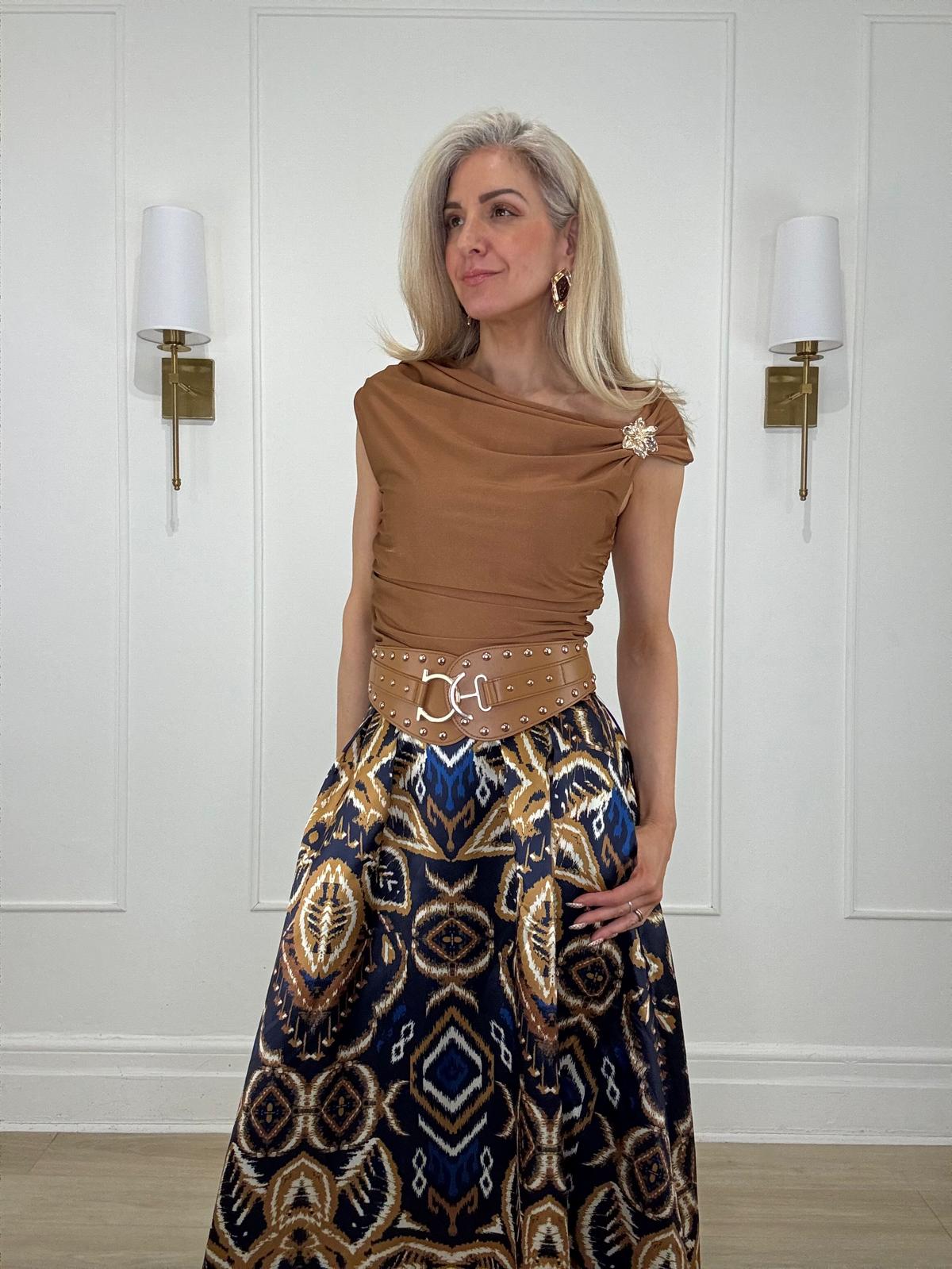 Short sleeve, asymetric ruched top with a side golden fllower detail giving an elegant unique design.