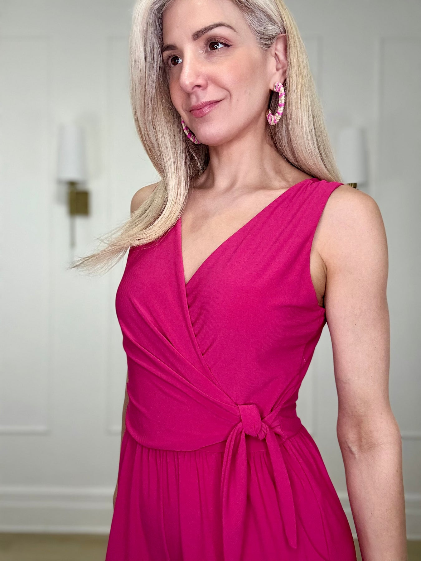 Surplice front with side tie sleeveless wide leg jumpsuit.