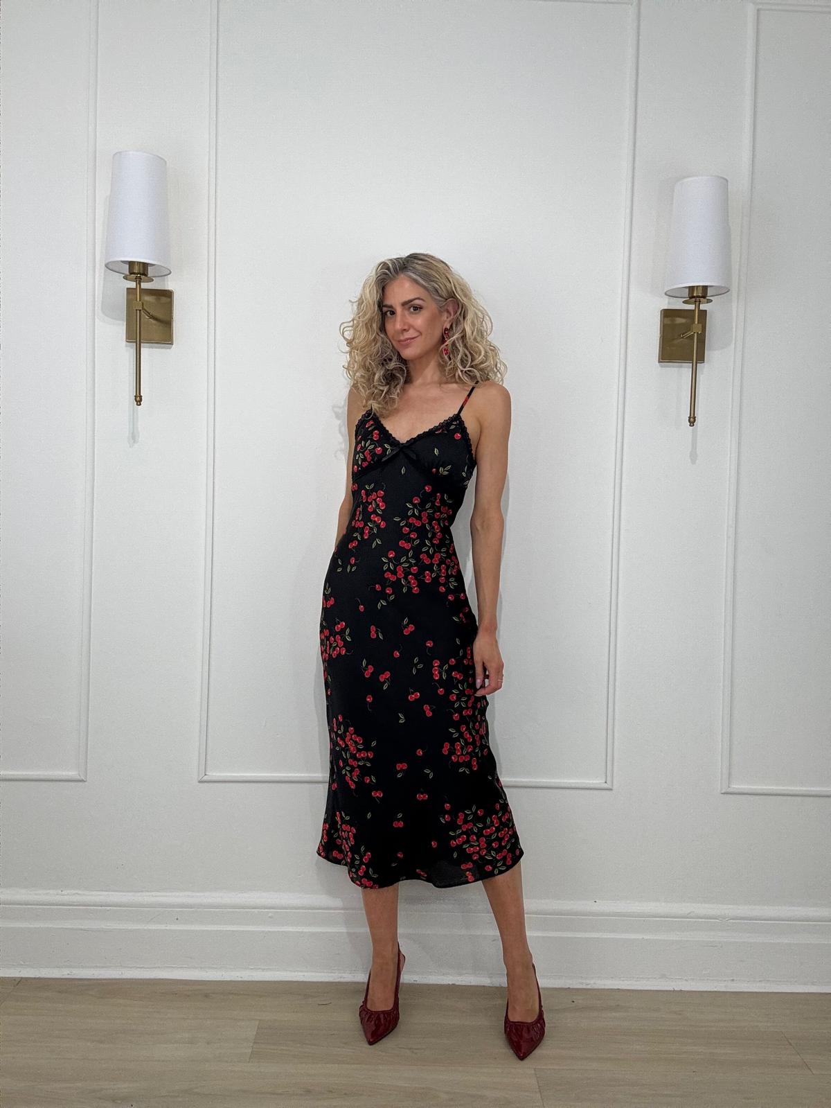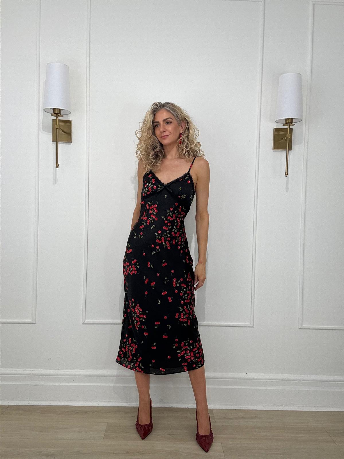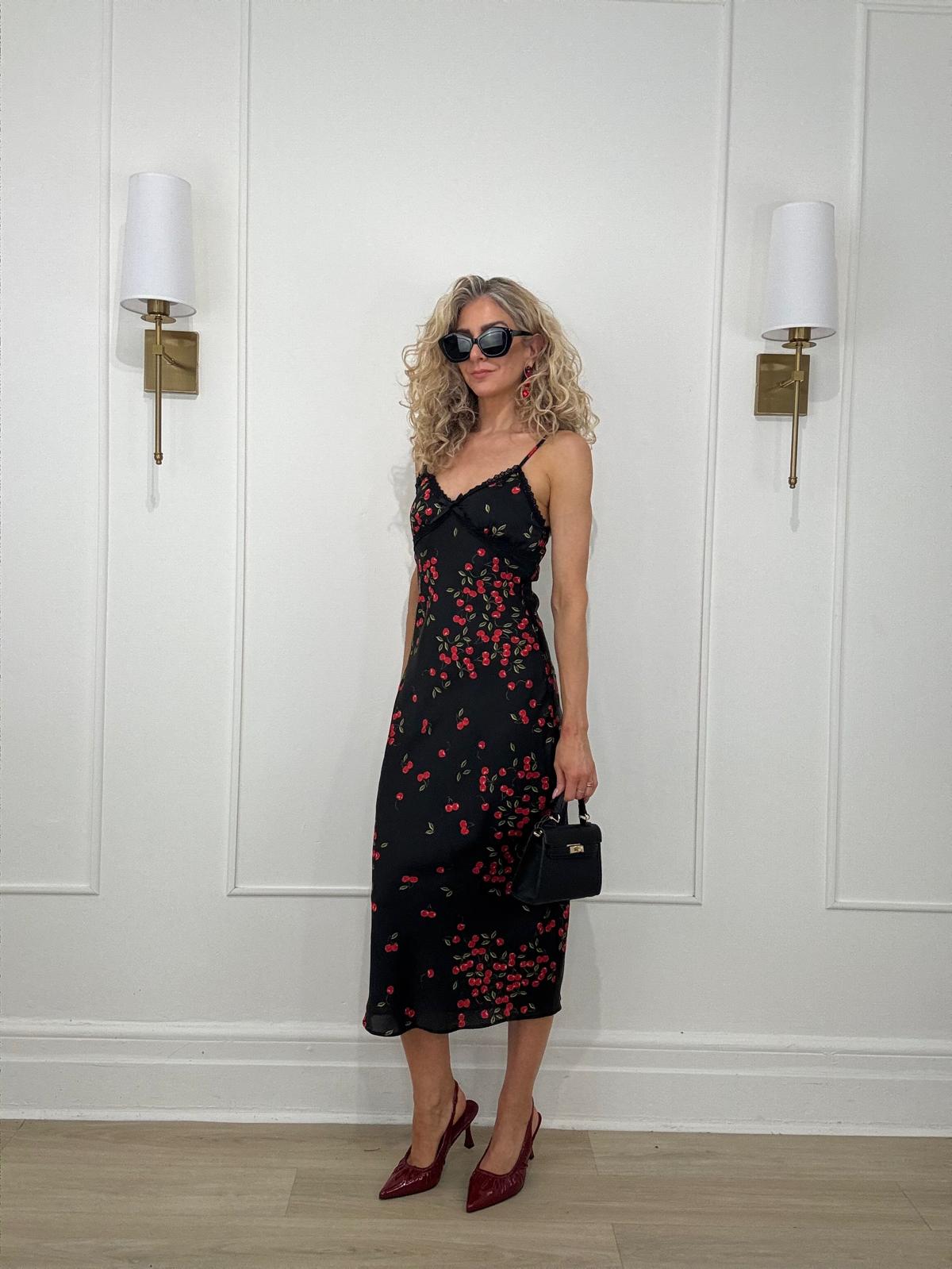 Cherry print midi dress with crochet detail and side zipper with hook & eye. Adjustable straps.