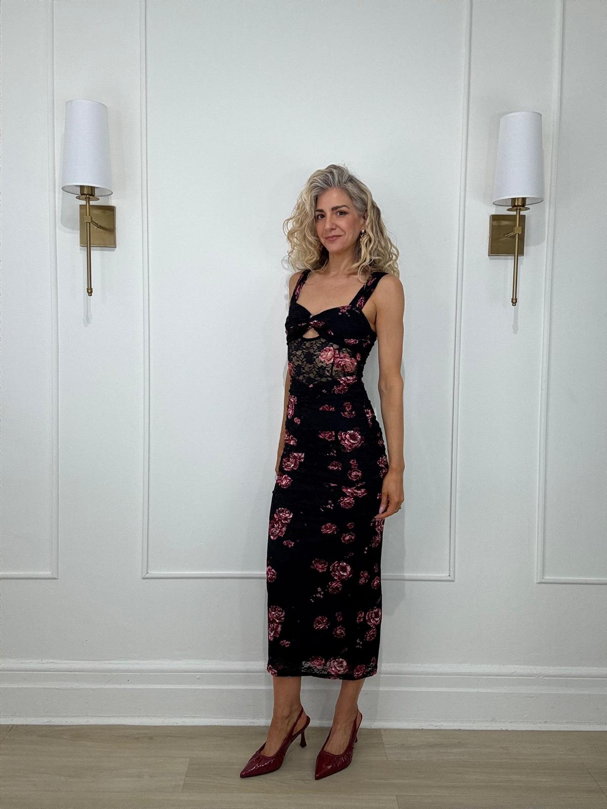 Lace bodycon dress with peekaboo front panel and  back zipper
