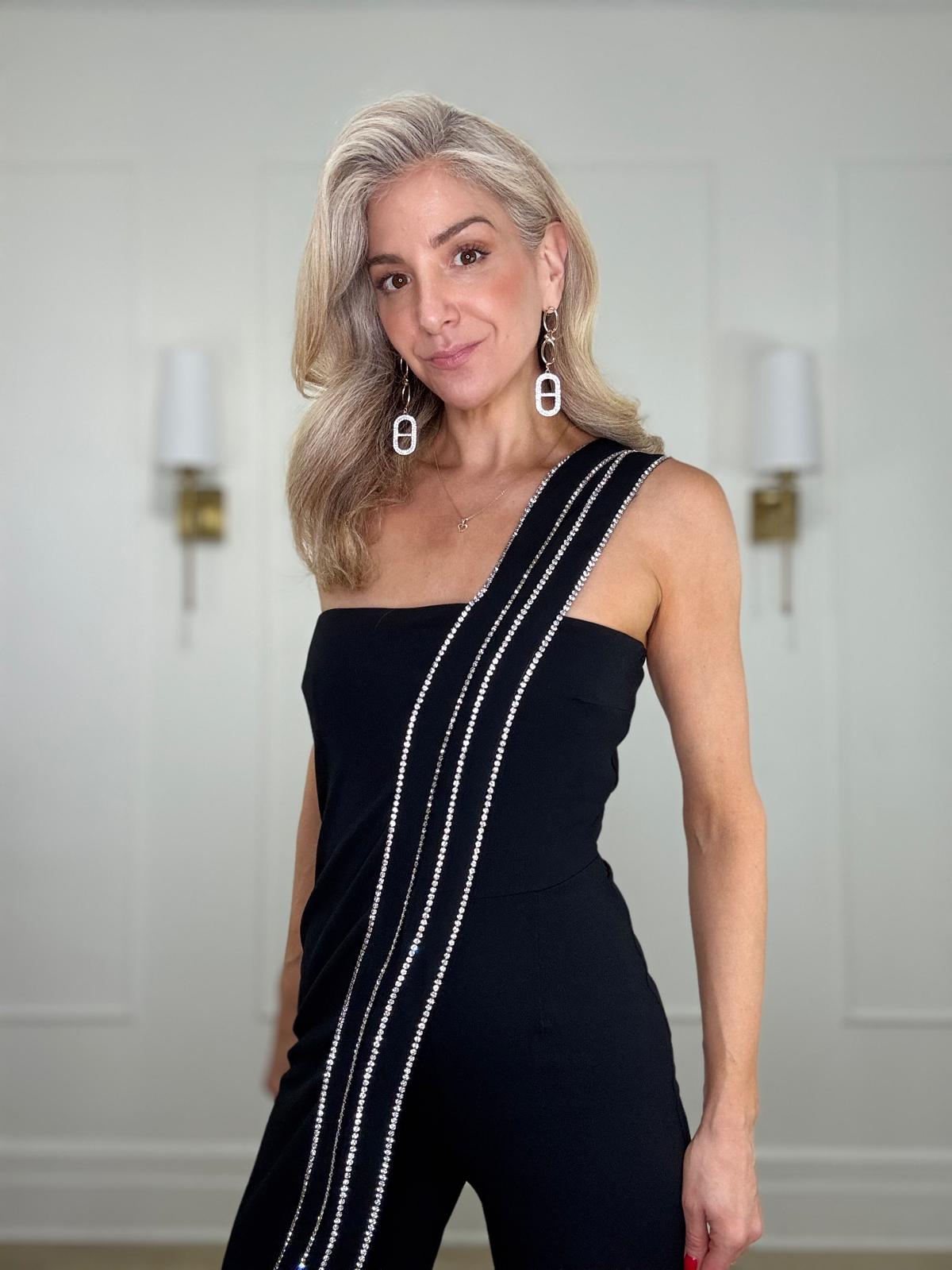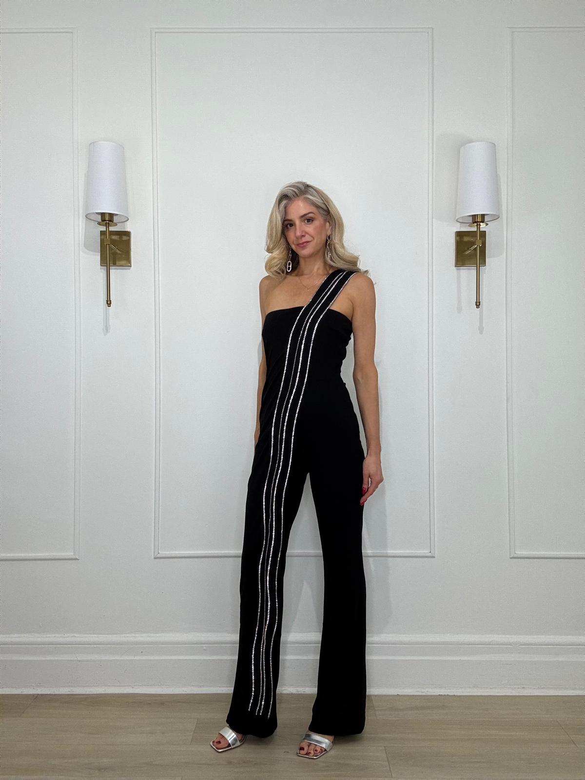 Half thick one shoulder strap dressy jumpsuit with side flap front layer with double rhinestone hem edging.