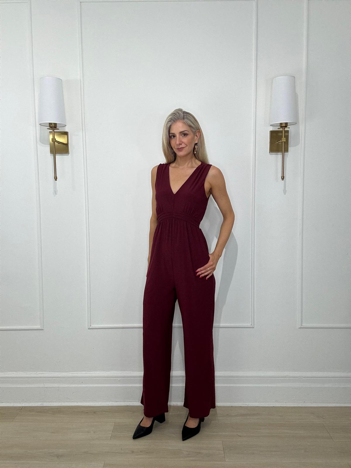 Stretch jumpsuit with attached waist tie. Key hole button closure at back of neck. Pockets.