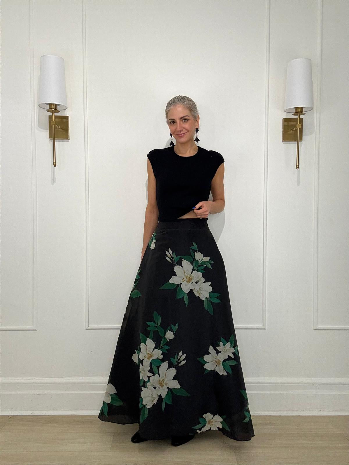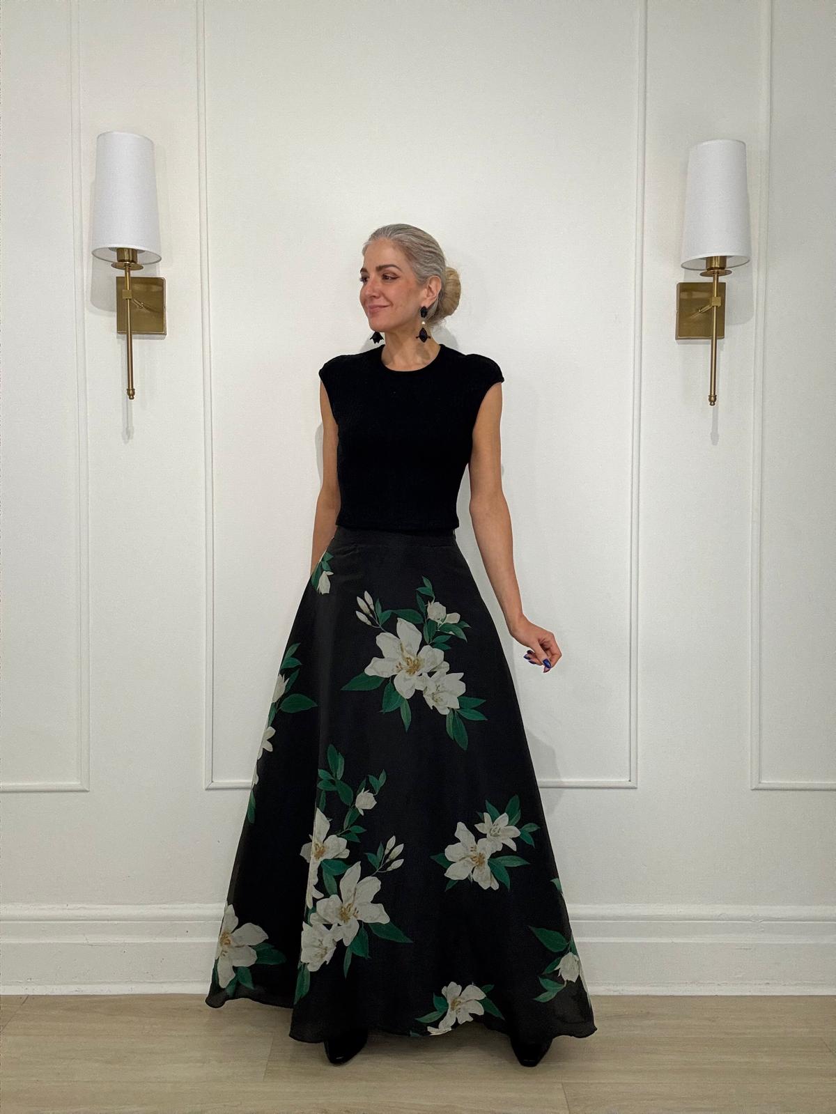 Floral print maxi skirt with side zipper closure.
