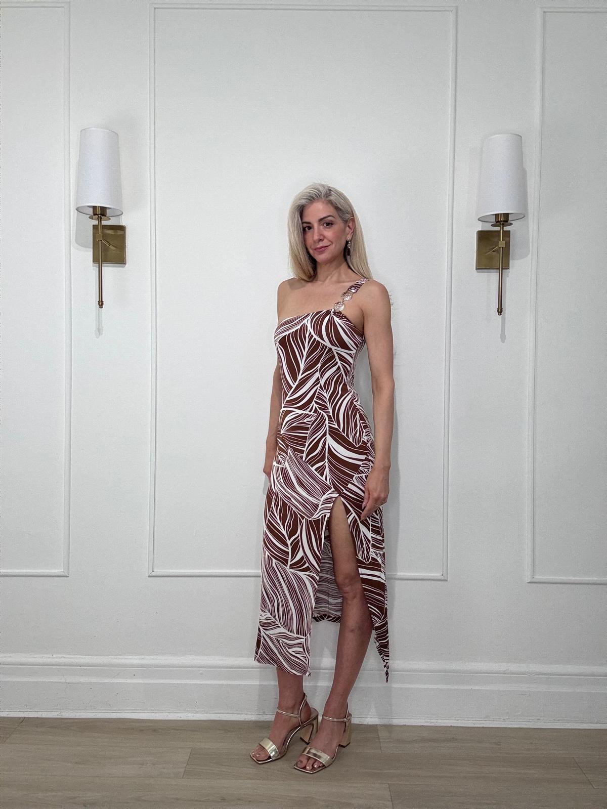 Tropical leaf print midi dress with one shoulder gold metal detail, and side slit.
