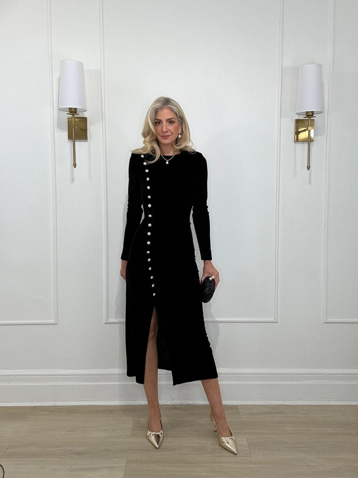 velvet midi dress featuring round neckline long sleeve, side pearl button down and back zipper closure.