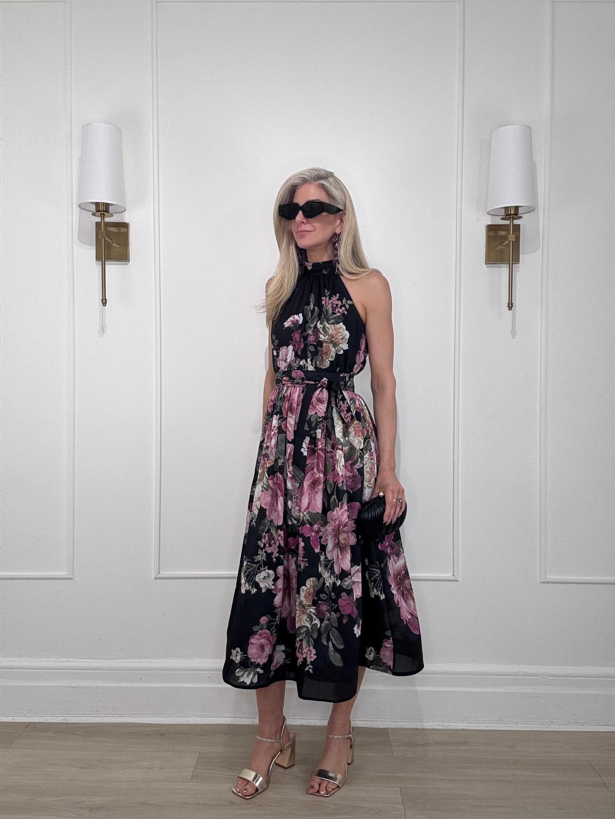 hi neck back tie sleeveless floral print fit & flare midi dress with waist tie.