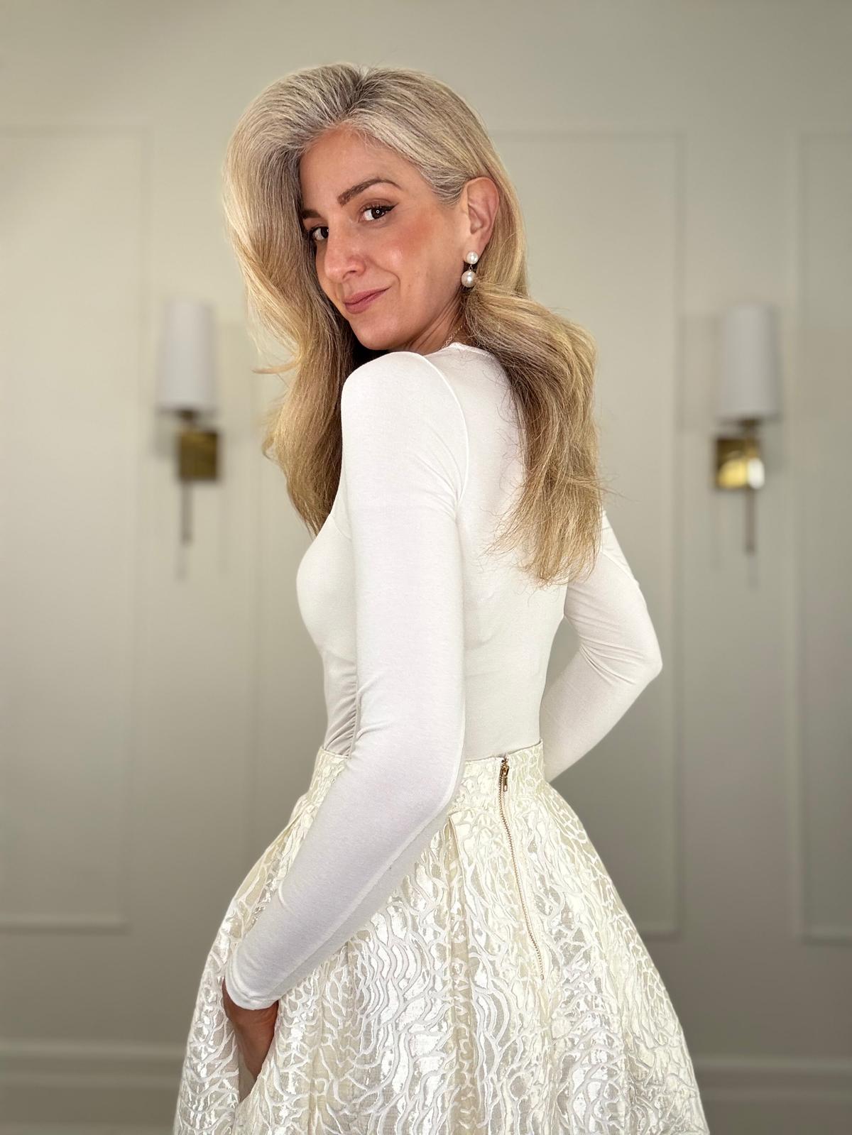 Rose flower textured woven full midi skirt with invisible side pockets and a back zipper closure.