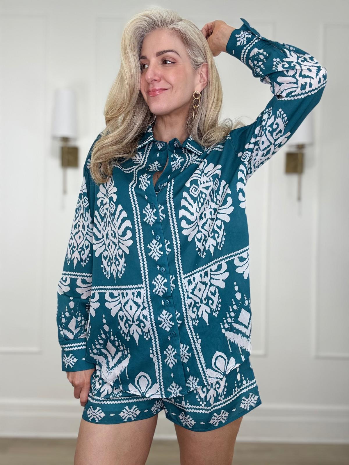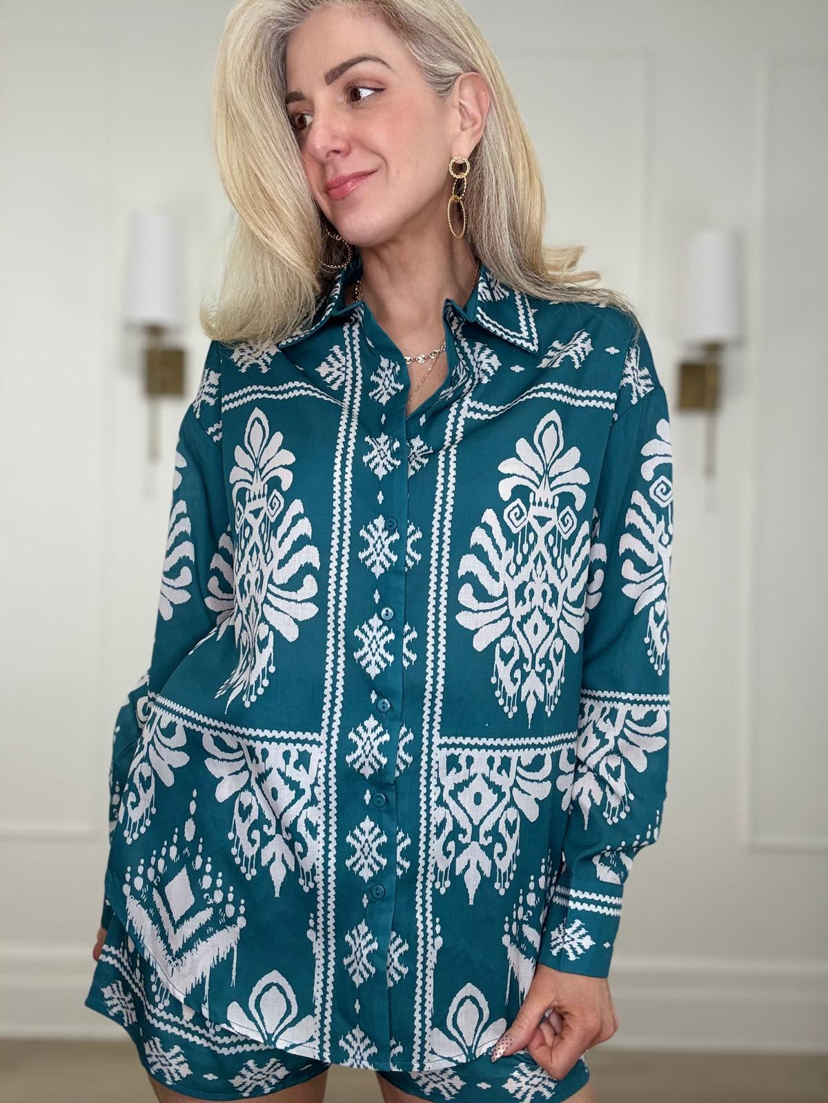 Ikat print button down collar dress shirt top.