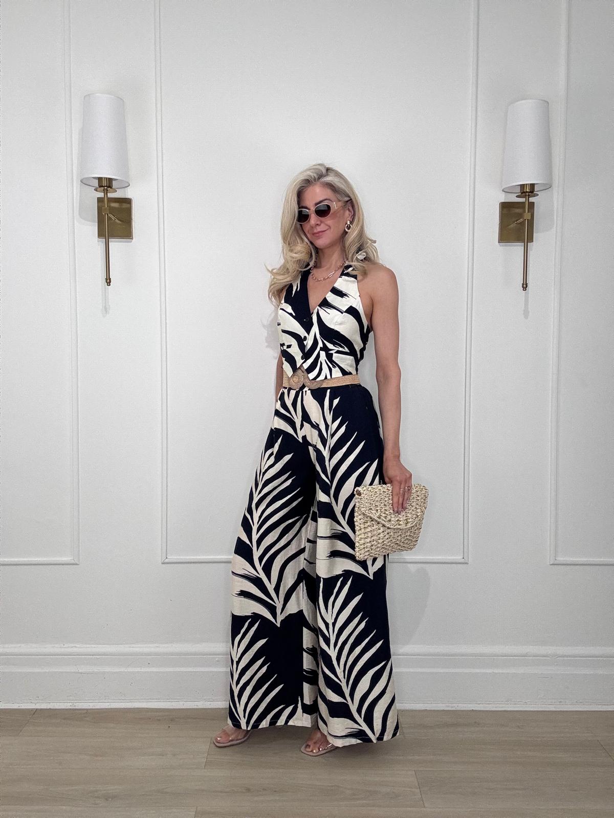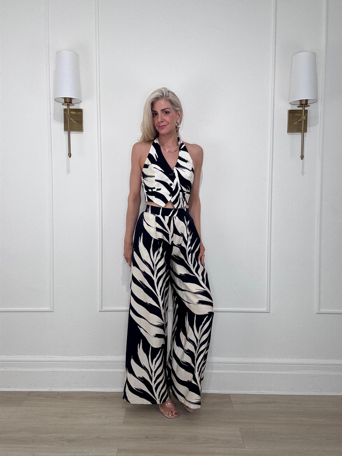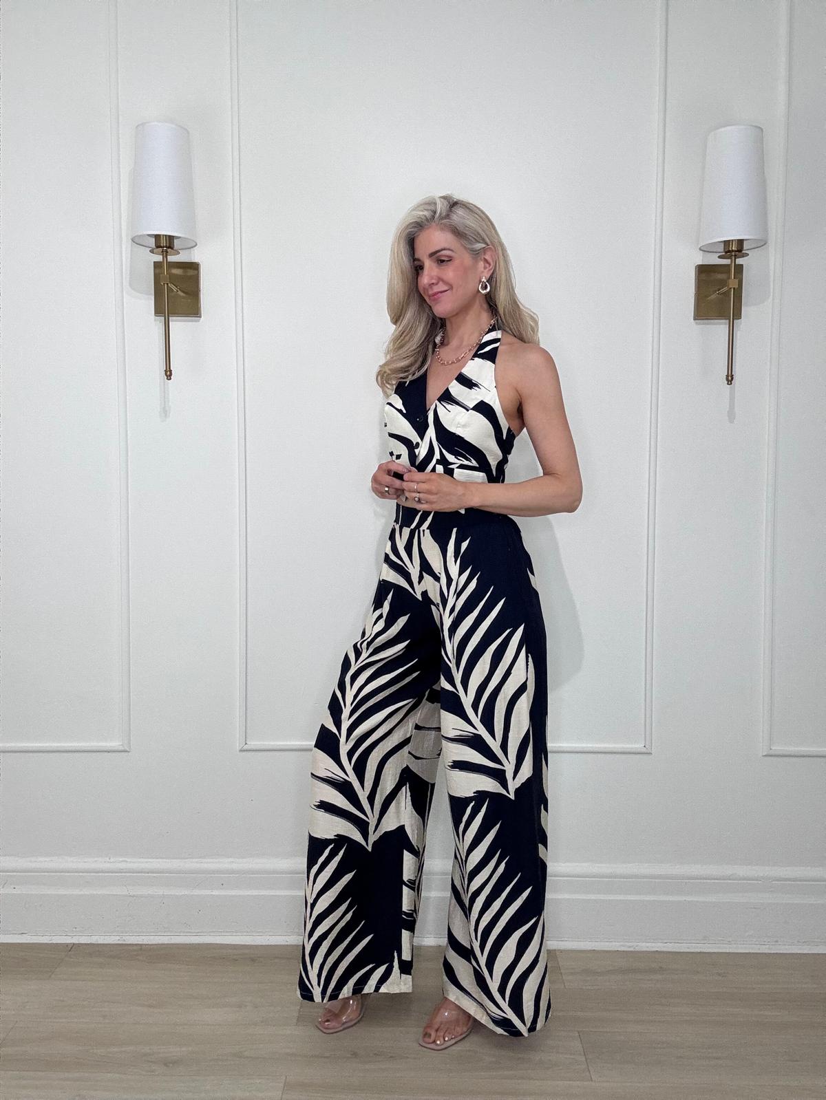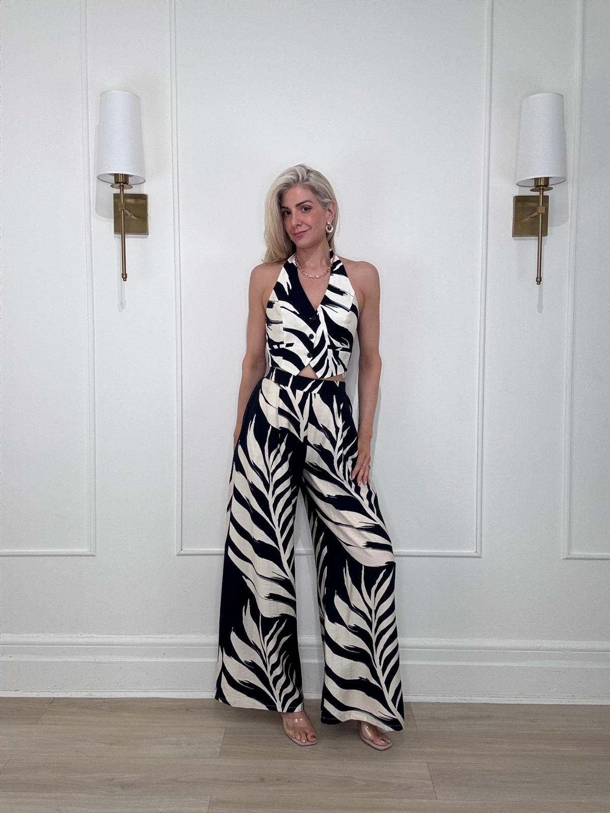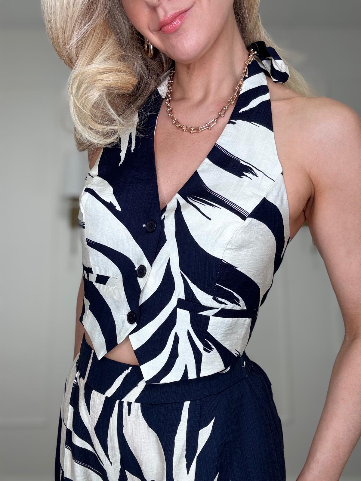 Tropical leaf print button front tie neck halter crop top with ruched back for a personalized and comfortable fit.