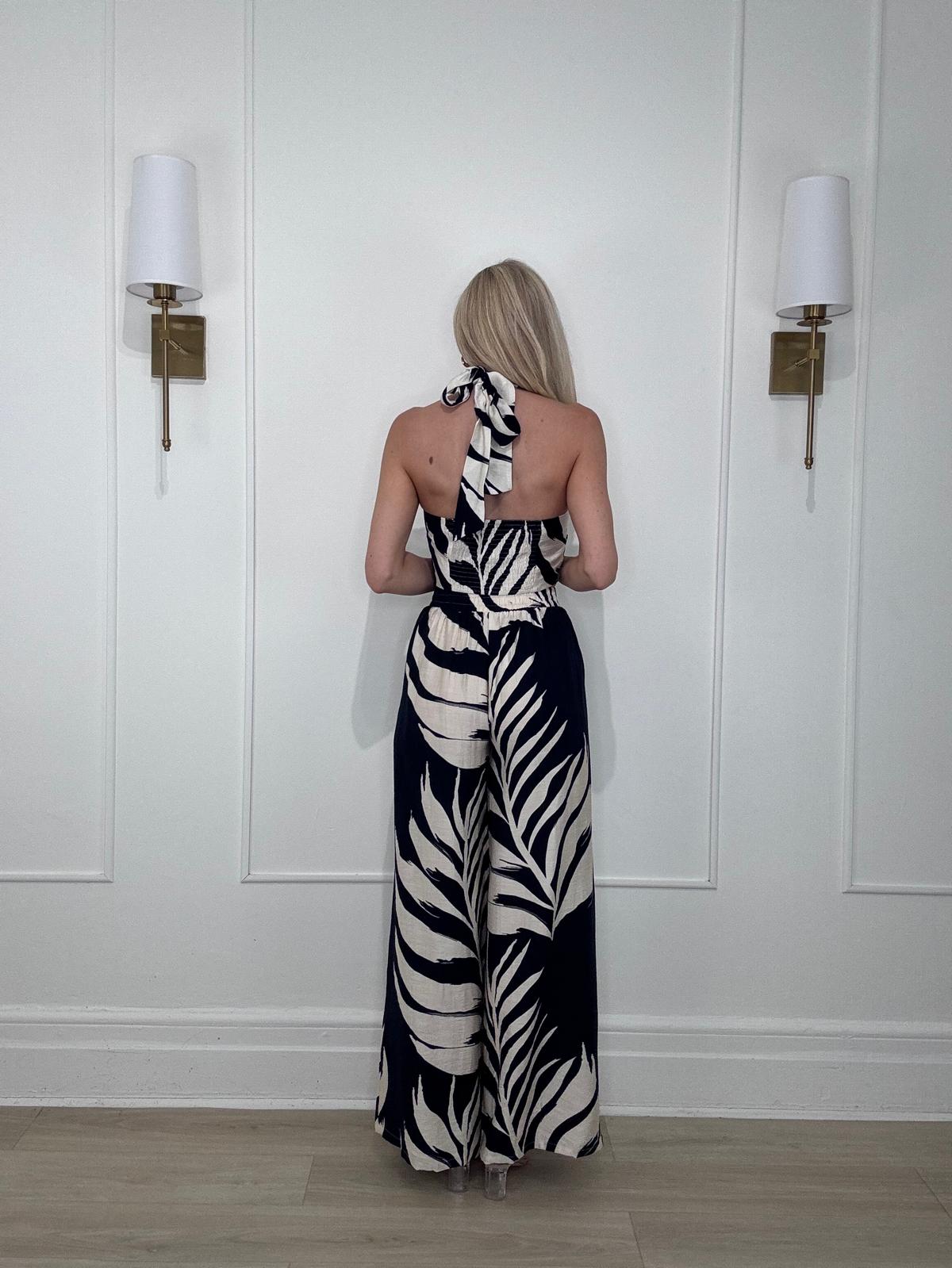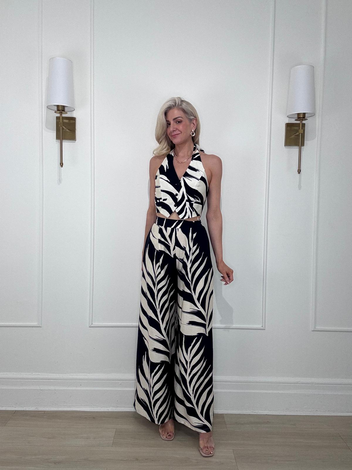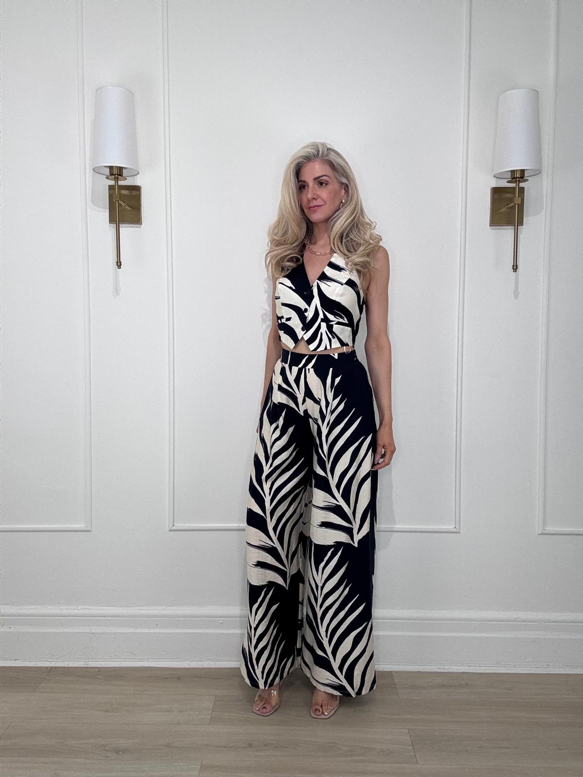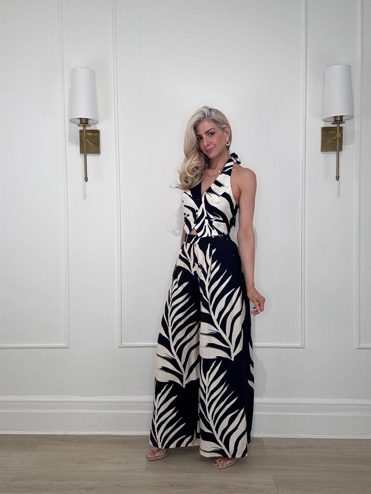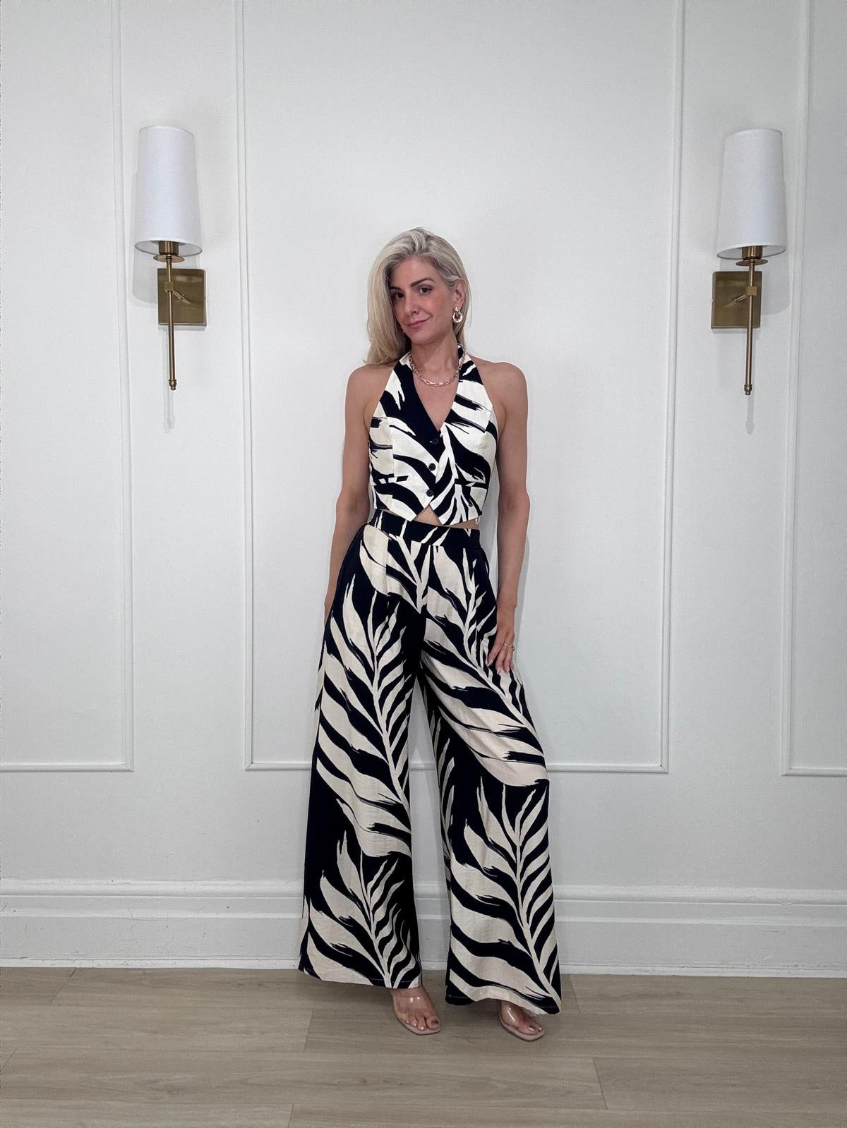 Tropical leaf print wide leg pants with single-pleat detail, an elasticized waistband at back, and side pockets.