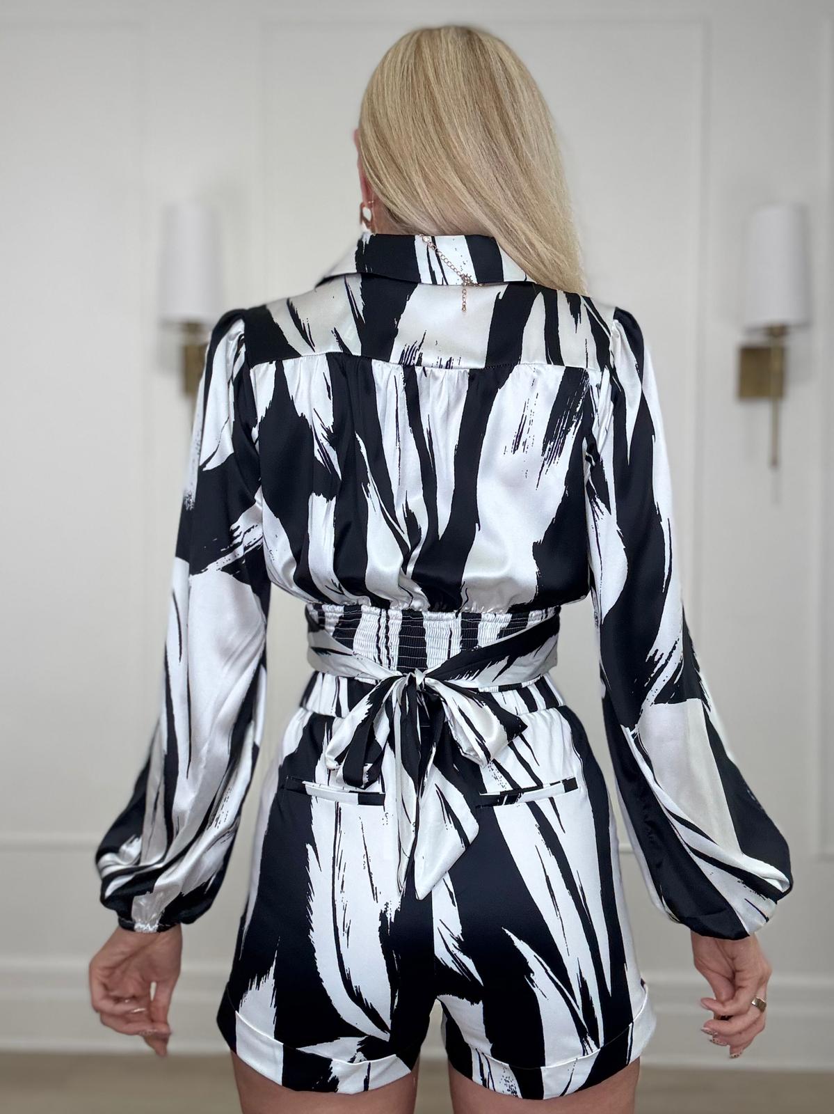 Abstract paint stroke print long sleeve crop top with a collar surplice front, ruched waist at back with an attached tie sash.