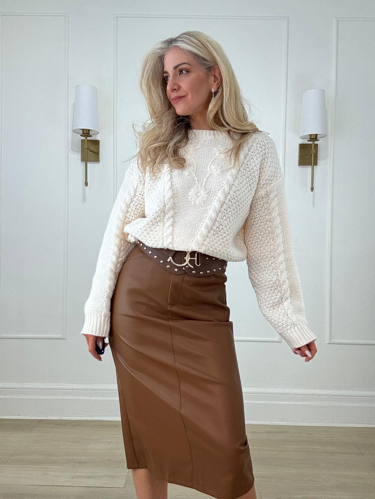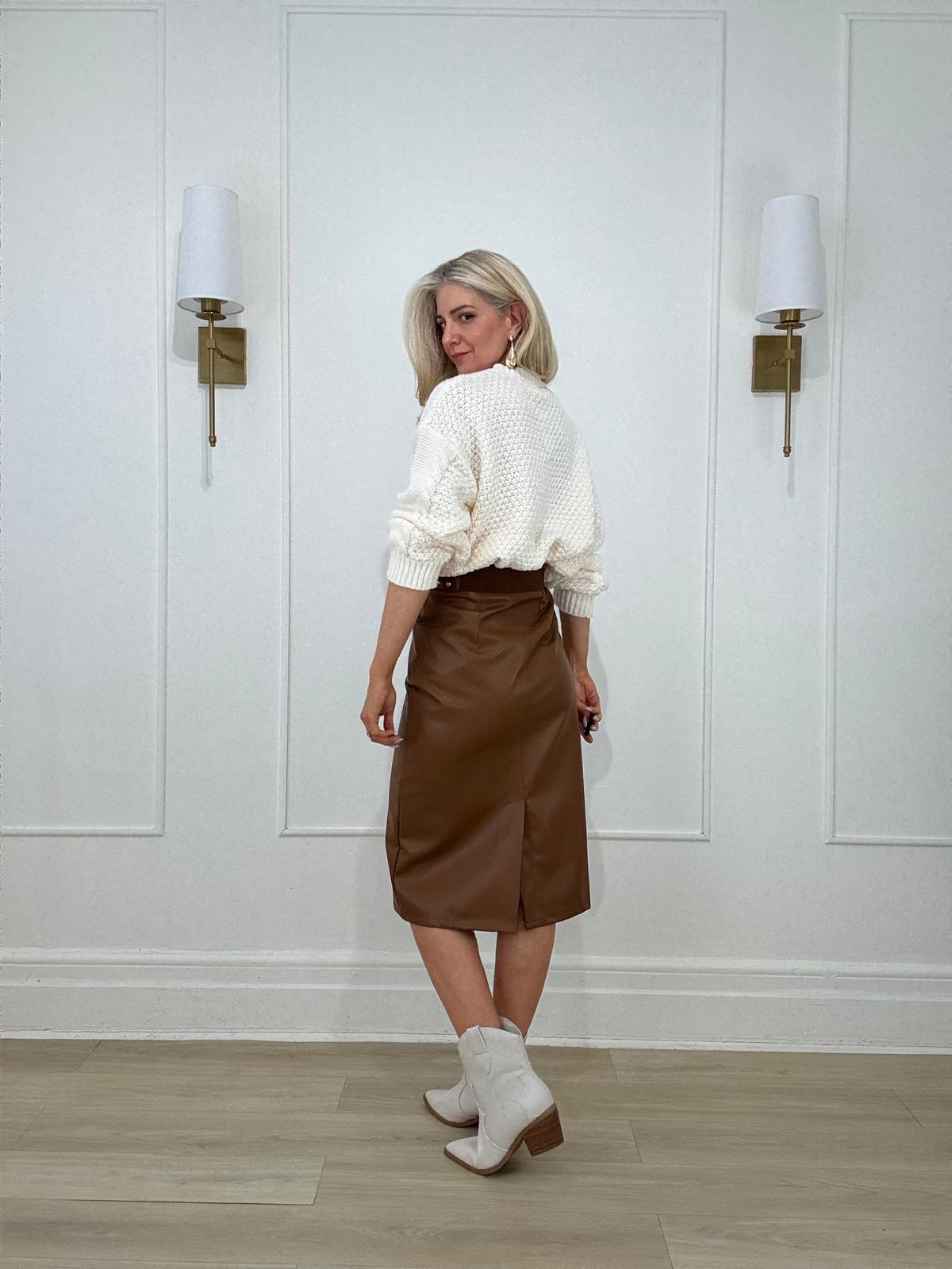 Faux leather pencil midi skirt with removable matching belt, belt loops, side pockets and back slit.
