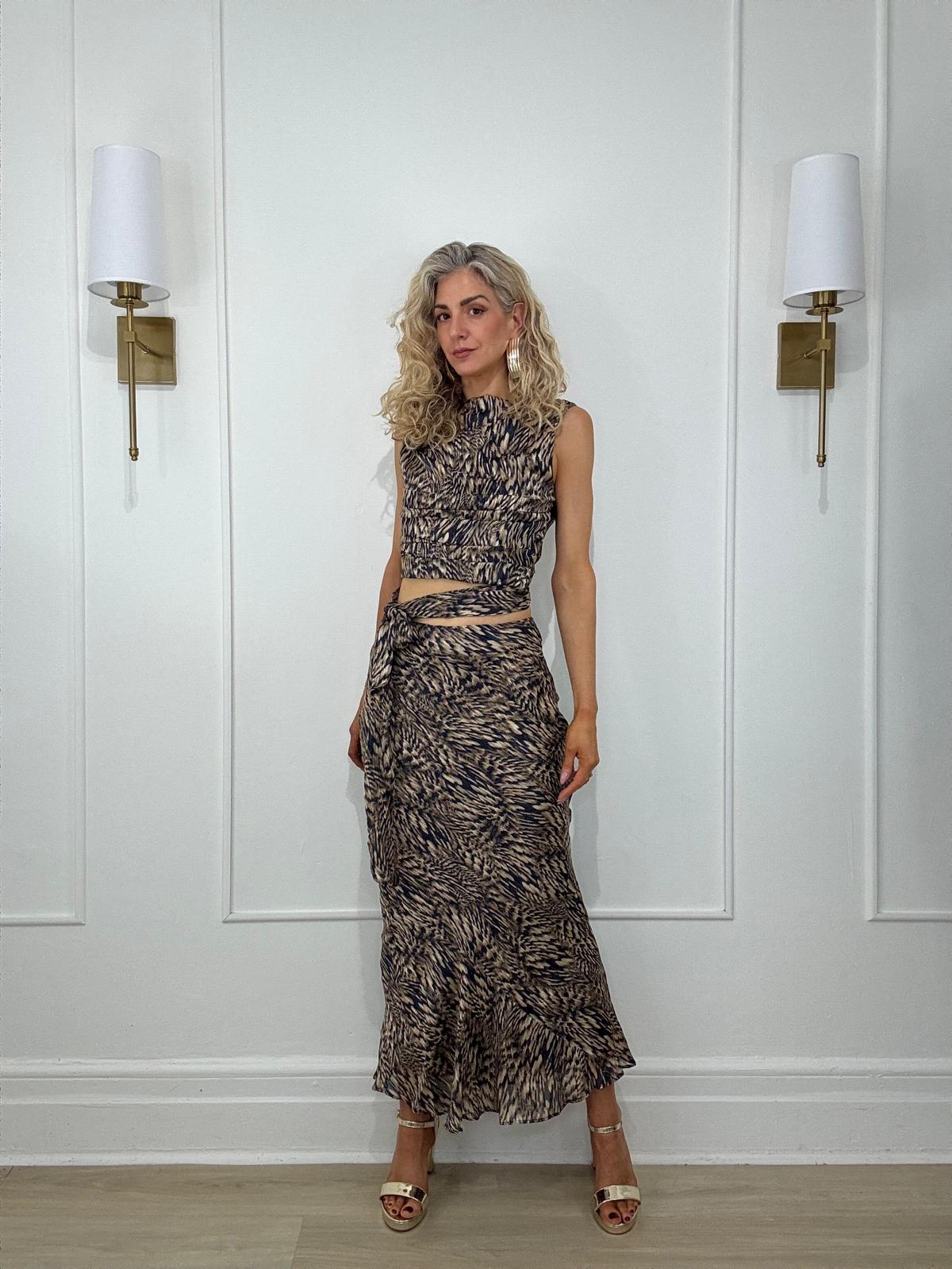 Metallic and printed maxi skirt with zipper closure.