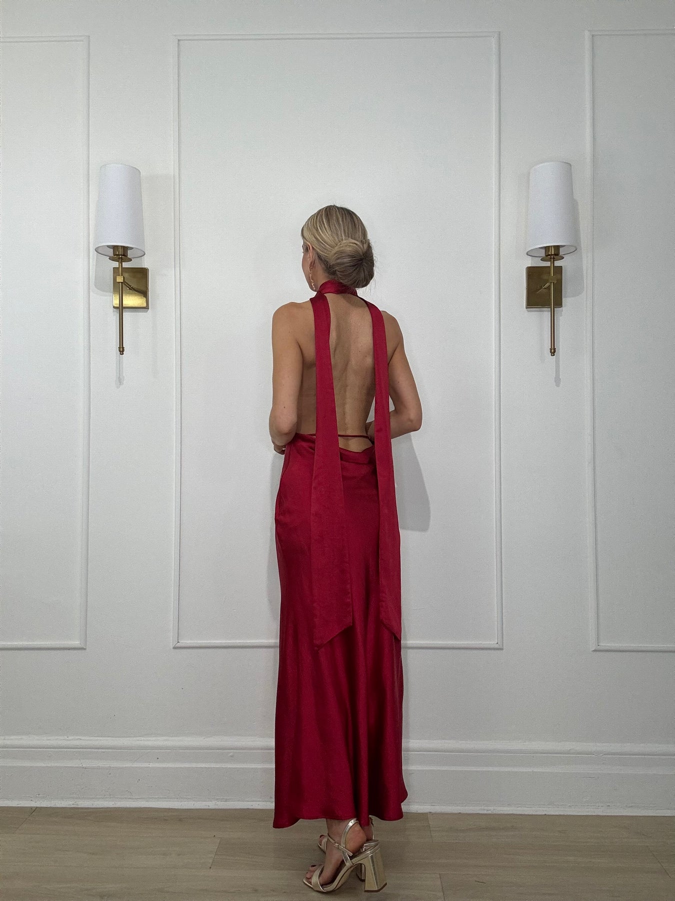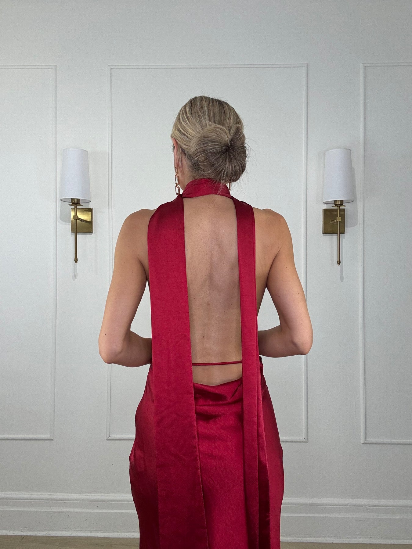 Low back, with rosette pin included to pin closed at neck. Could also be tied in a halter style.