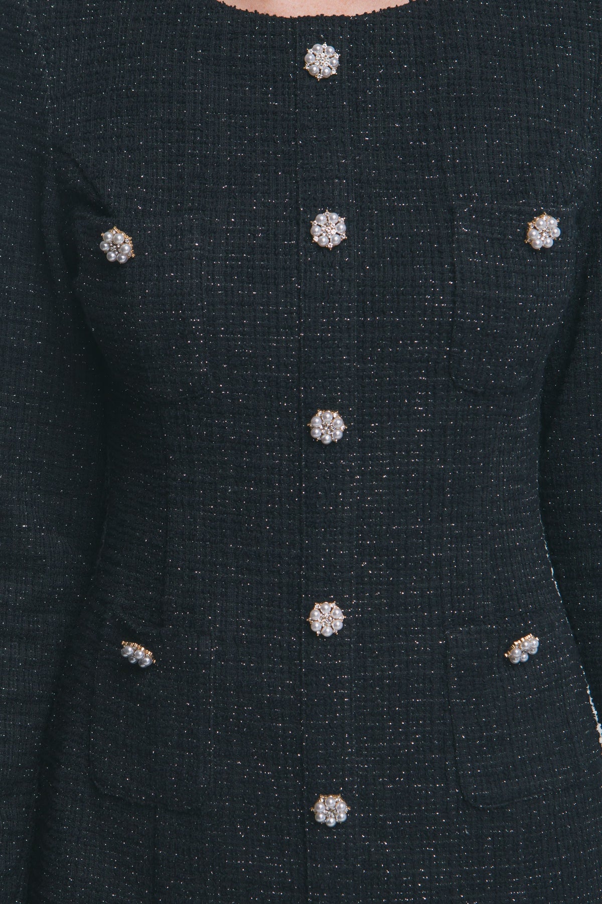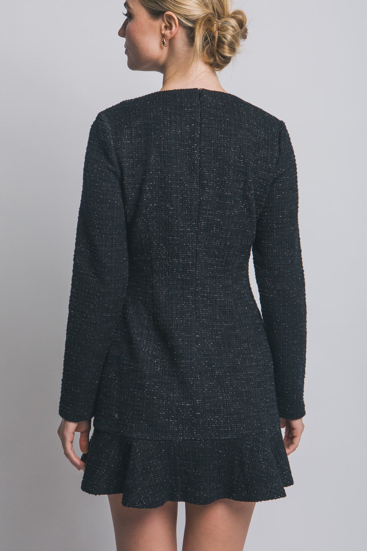 Long sleeve tweed single breasted mini dress with front buttons and a frill hemline.