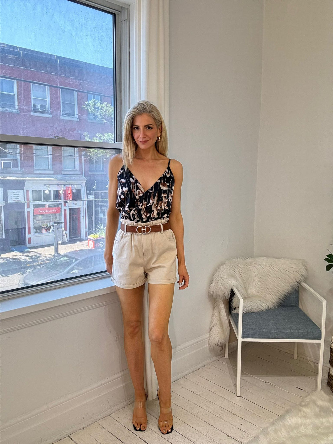 Double buttoned shorts with ruffled elasticised waistband detail. Rolled hem, belt loops, pockets, and made from 2% stretch cotton.